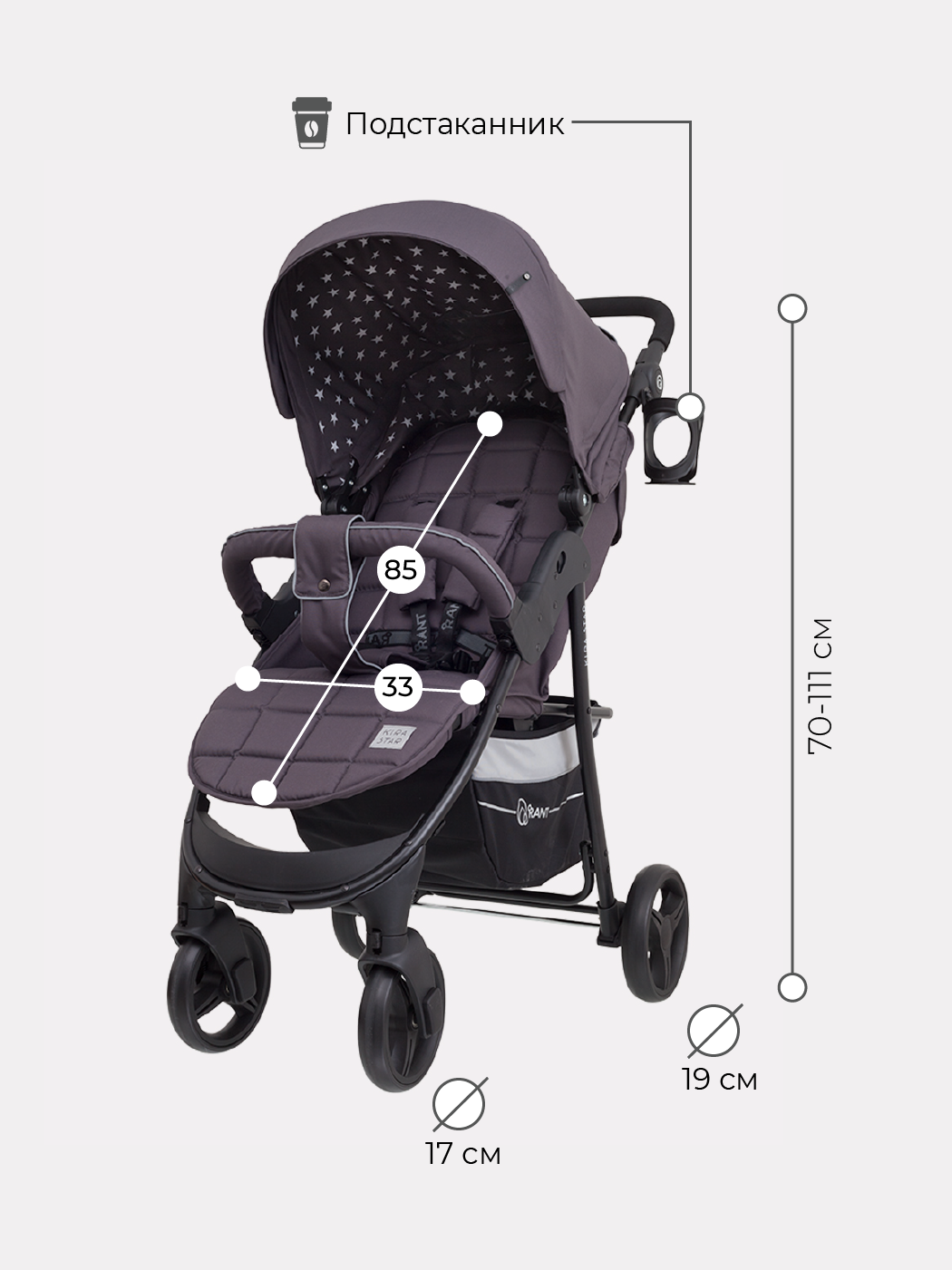 Коляска Rant KIRA STAR (рант кира звезда) - коляска для ребенка от 6 месяцев с ярким и оригинальным дизайном. Внутри капюшона - звездное небо, которое успокоит ребенка и настроит на сон в коляске (если ребенок маленький и спит на улице). Вся обивка коляски (кроме капюшона) выполнена в практичном сером цвете, на котором не так заметна грязь с улицы.
