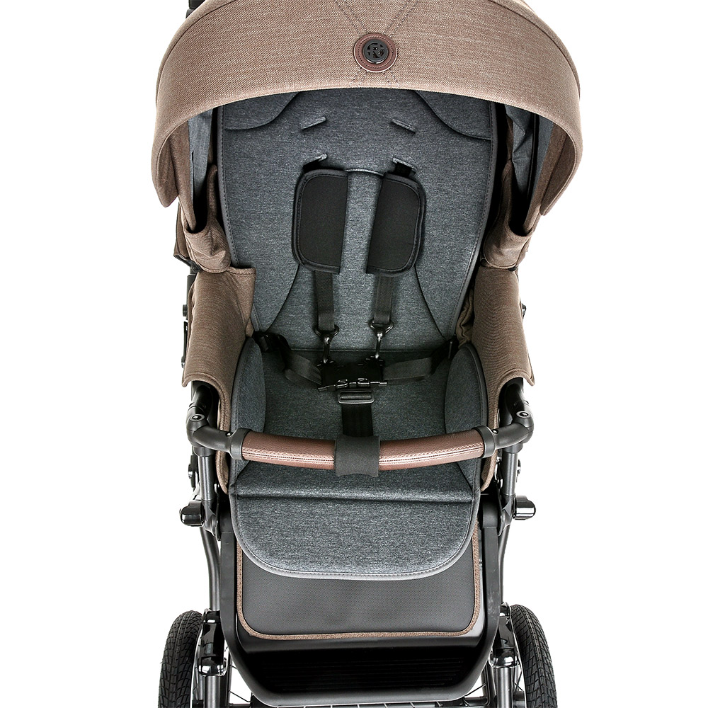 - Прогулочный блок имеет пятиточечные ремни безопасности и бампер-ограничитель с отделкой из экокожи. Бампер можно отсоединить с одной стороны и просто откинуть для удобства посадки ребенка.