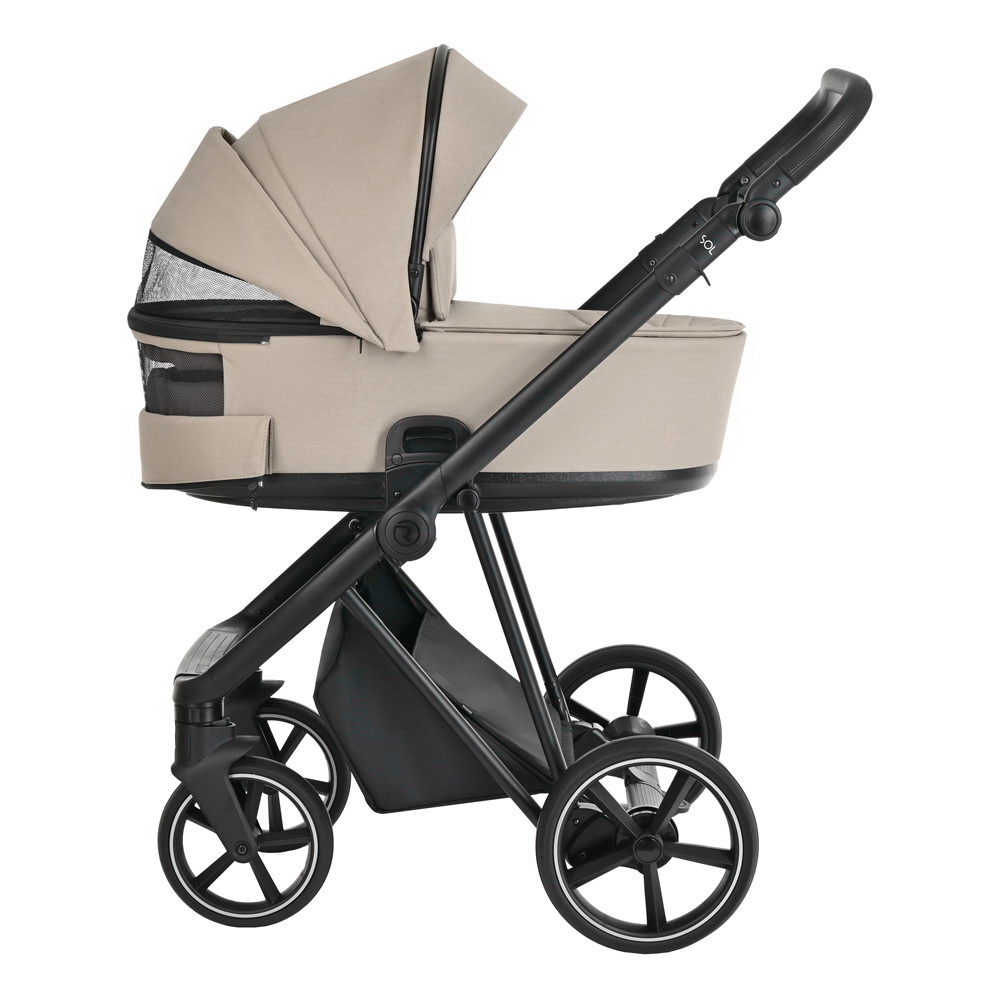 Полноразмерная, большая, бескаркасная люлька для новорожденного ребенка с очень легким весом. Ее легко сложить для поездки на машине, и она не займет много места. Внешняя часть люльки представлена в качественной, плотной водонепроницаемой ткани. Внутренняя часть коляски выполнена из натуральной ткани и может сниматься для стирки при необходимости. Люлька оснащена современной двойной вентиляцией: вентиляционное окошко на капюшоне и окошко на самом каркасе люльки. Такая вентиляция в жаркий день обеспечит прохладу и оптимальную циркуляцию воздуха внутри коляски. В зимний период времени все окошки надежно закрываются, а для дополнительной защиты новорожденного предусмотрен специальный дополнительный бортик.