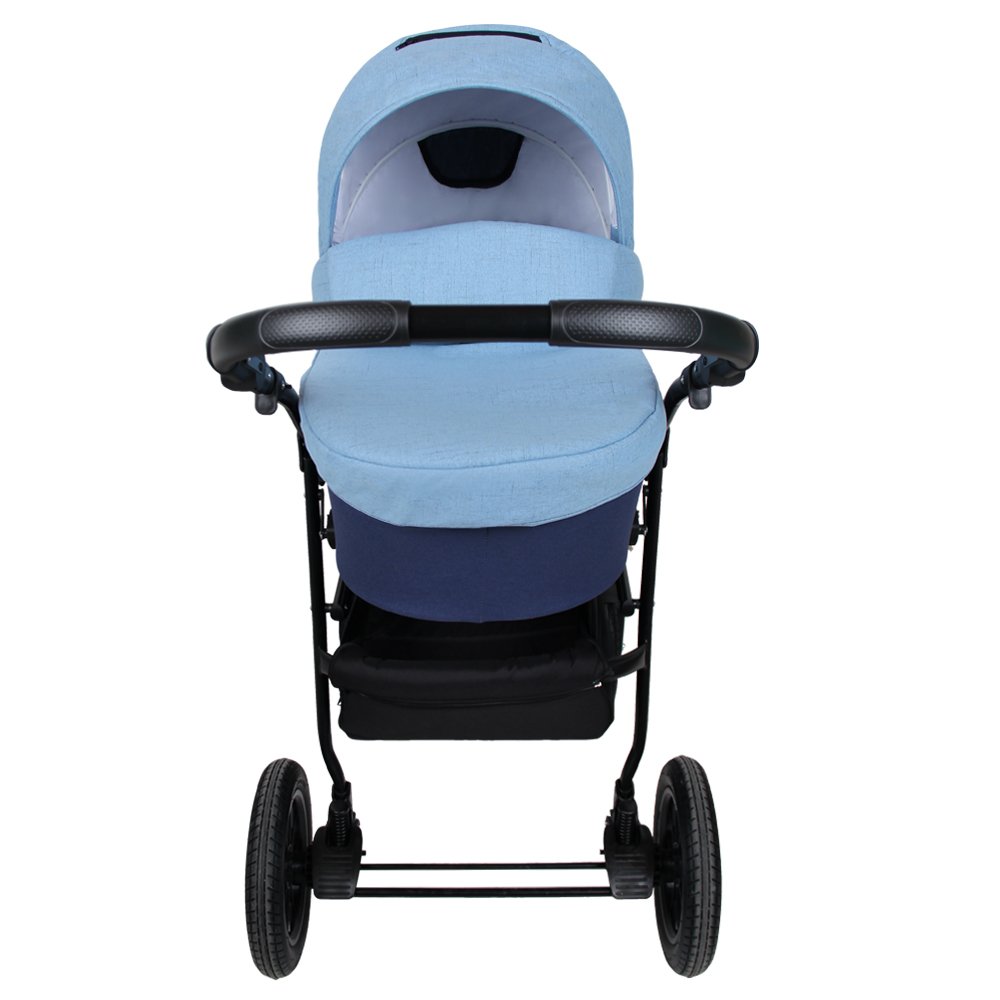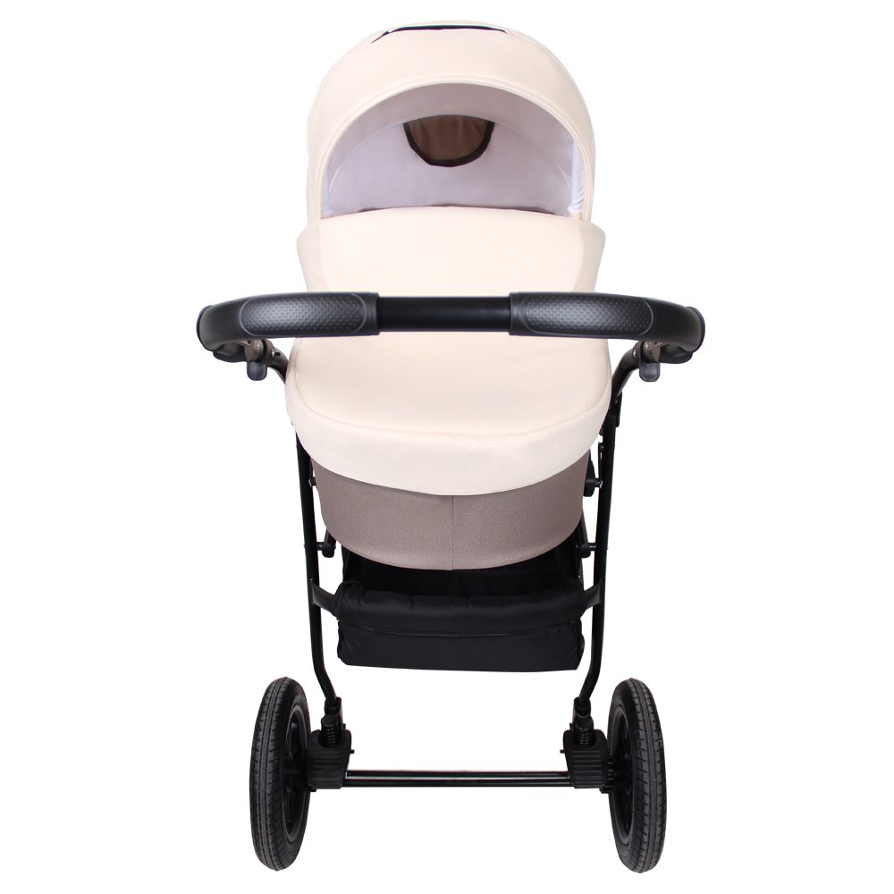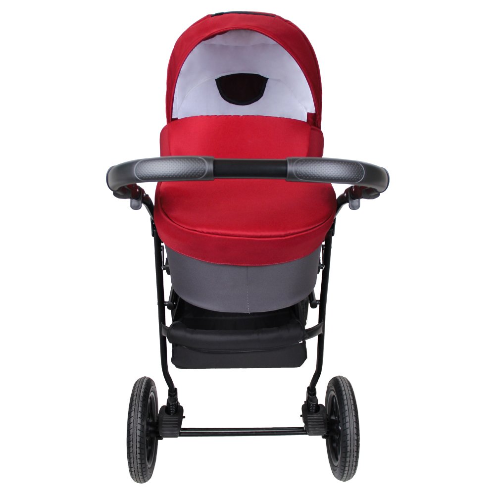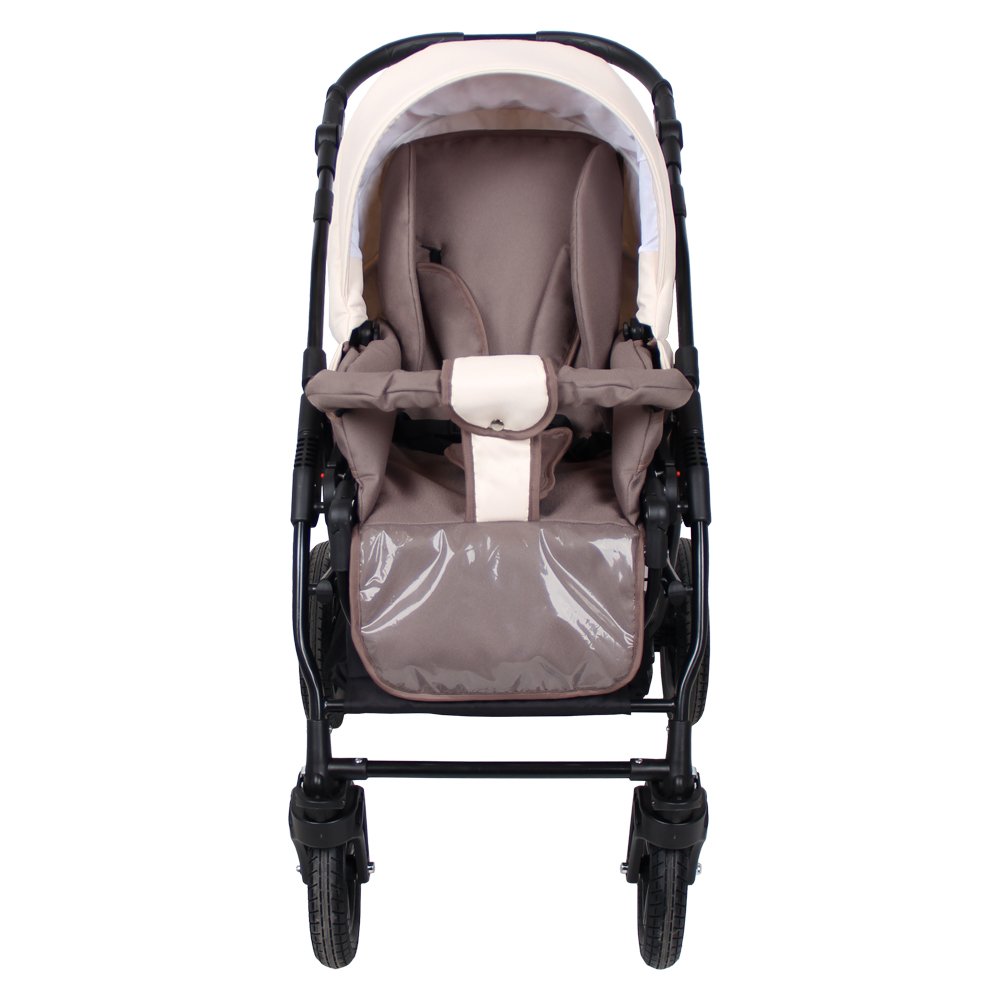 Модель имеет компактные размеры и удобное шасси с большими надувными колесами. Все колеса оснащены амортизацией, что позволит с легкостью преодолевать любые препятствия на своем пути, мягко ездить по любому бездорожью. Под коляской размещена вместительная корзина для игрушек и покупок. Большая комплектация позволит гулять в любую погоду и не докупать к коляске ни чего лишнего.