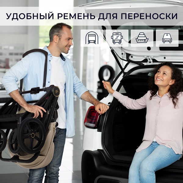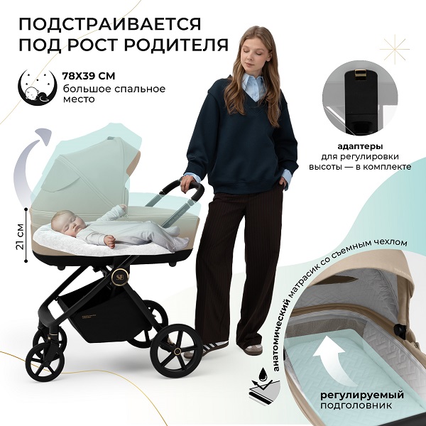 - Телескопическая ручка коляски подстраивается под любой рост родителей, обеспечивая интуитивное управление без лишних усилий.