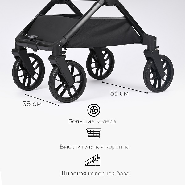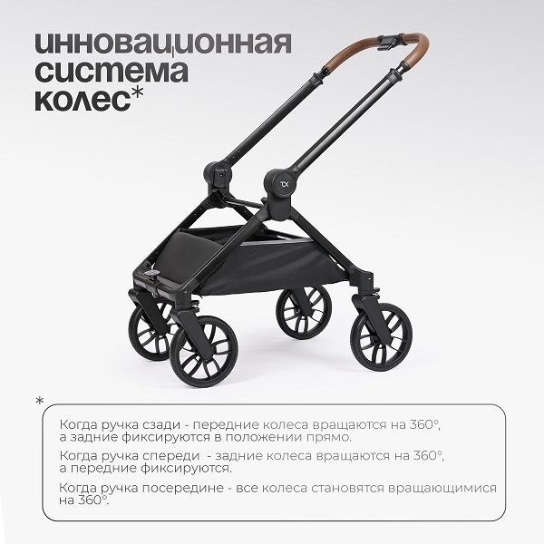 Быстросъёмные реверсивные блоки позволяют легко менять положение люльки или прогулочного блока в зависимости от возраста и потребностей малыша. Передние и задние колёса коляски поворачиваются на 360 градусов, обеспечивая отличную манёвренность и лёгкость управления даже на неровных поверхностях. Диаметр колёс составляет 20 см, что гарантирует устойчивость и проходимость коляски.