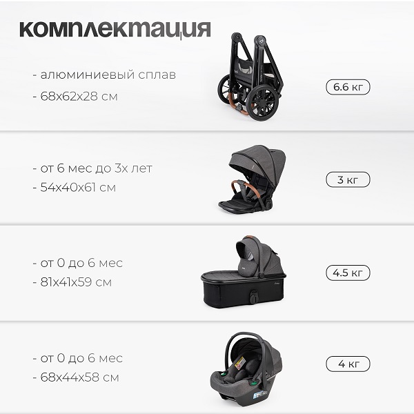 В комплекте: люлька, прогулочный блок, дождевик, москитка, автокресло с адаптерами.