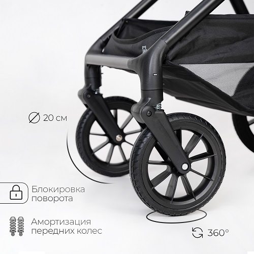Коляска с люлькой весит всего 10 кг, а с прогулочным блоком 9,9кг. Коляска легко управляется за счет непрокалываемых резиновых колес с амортизацией. Передние колеса поворотные, что позволит легко объезжать препятствия на дороге. Телескопическая ручка позволит настроить коляску под любой рост родителей.