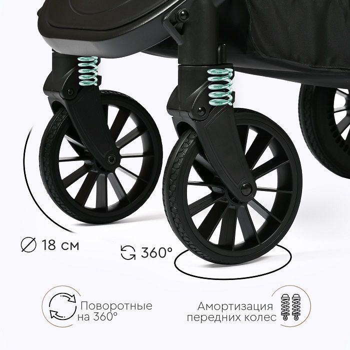 - Передние поворотные колеса оснащены амортизацией для плавного движения, а также имеют возможность фиксации.