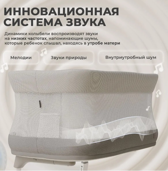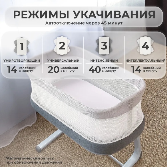 На выбор — три скорости укачивания. Каждый из режимов позволяет добиться нужного эффекта: умиротворяющий режим помогает расслабиться и легче уснуть, а интенсивный стимулирует сенсорные рецепторы и снижает возбуждение и беспокойство.