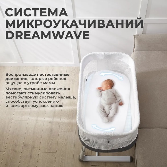 В числе главных преимуществ приставной кроватки для новорожденного Nuovita Accanto Cielo — инновационная электронная система укачивания Dreamwave. Механизм качает ложе изолированно от остальной кроватки, максимально правдоподобно имитируя движения, которые ребенок испытывал во внутриутробном состоянии. Такое качание позволяет добиться дополнительных 2-3х часов сна маме и малышу.