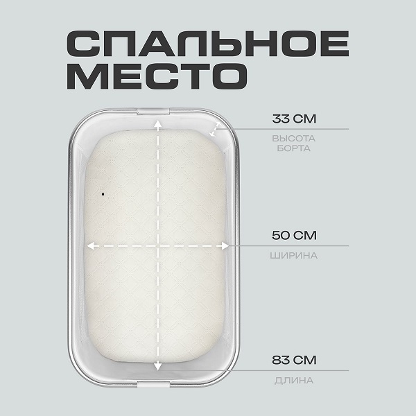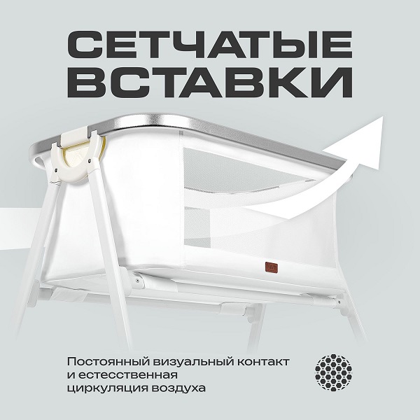 Для ребенка предусмотрено просторное спальное место 83х50х33 см. Высокие бортики защитят ребенка от сквозняков и создадут комфортную атмосферу для сна. Два сетчатых окошка улучшают циркуляцию воздуха в колыбельке и позволяют родителям всегда видеть ребенка.