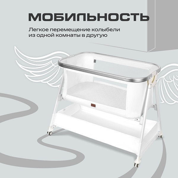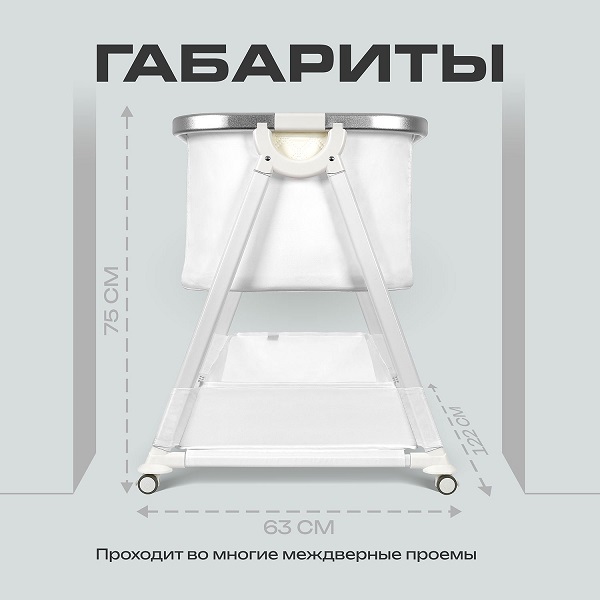 Благодаря прорезиненным колесам колыбельку очень легко перемещать по комнате, а за счет небольшой ширины всего 63 см, колыбелька пройдет почти в любые дверные проемы.