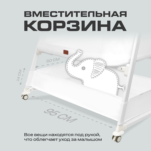 Под колыбелькой размещена удобная корзинка для важных для ребенка вещей.