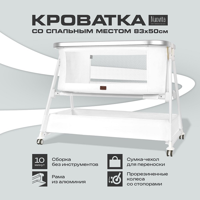 Детская колыбель Nuovita Accanto Vanni (нуовита акканто ванни) - вместительная, современная кроватка для новорожденного ребенка в элегантном дизайнерском исполнении. Преимущество кроватки в простоте сборке и ее легком перемещении по квартире, дому. Вы всегда сможете находиться рядом с ребенком, занимаясь своими делами и свободно перемещаясь по квартире. В отличие от переносных шезлонгов и других похожих устройств, у ребенка будет полноценной, ровное спальное место в котором малыш может спокойно спать или бодрствовать долгое время без вреда для здоровья. Так же кроватка очень быстро и компактно складывается и всегда готова к поездкам и путешествиям.