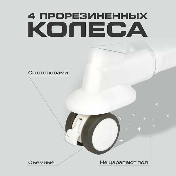 - Прорезиненные колеса со стопорами не царапают напольное покрытие и обеспечивают мягкий ход при перемещении.