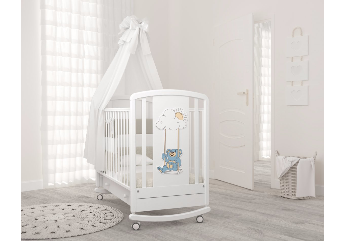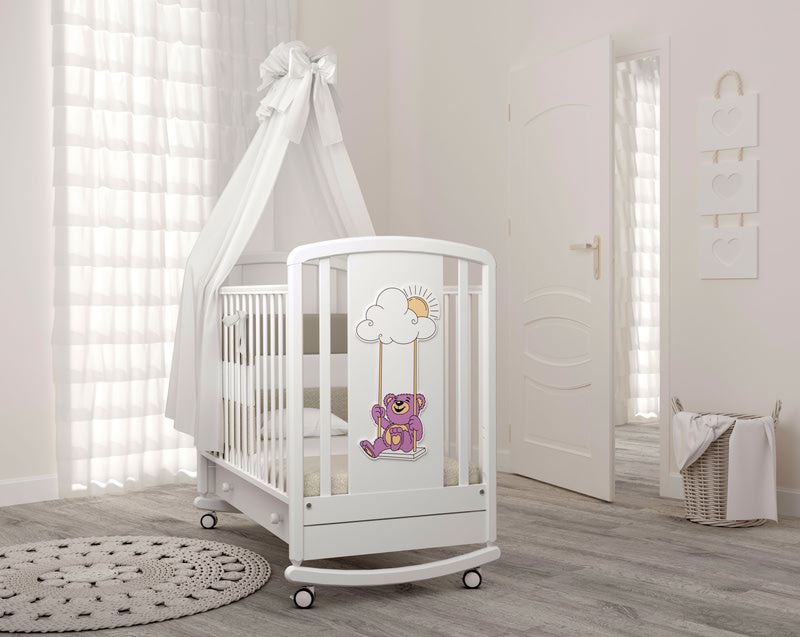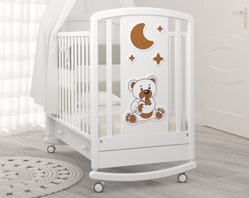 Детская кровать Angela Bella Жаклин колесо-качалка с ящиком (Анжела Белла) - красивая и надежная кроватка для ребенка с рождения до 3 лет из массива бука. Эта модель имеет компактные размеры и прекрасно впишется в любую детскую комнату. Красивые бортики украшены аппликацией с Мишкой.