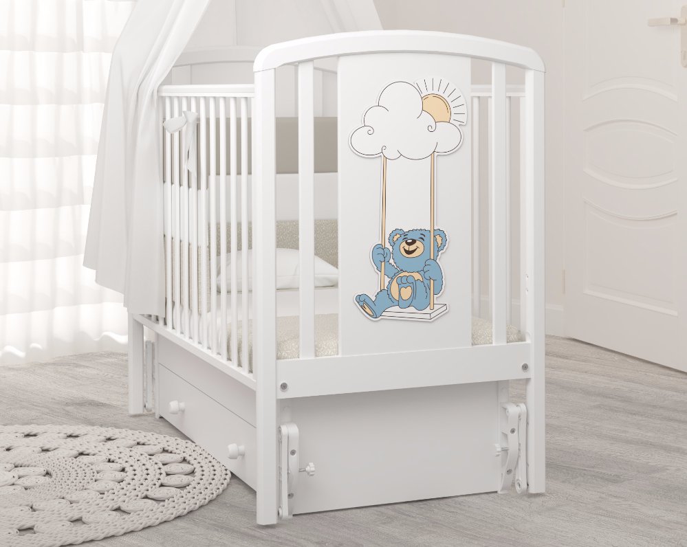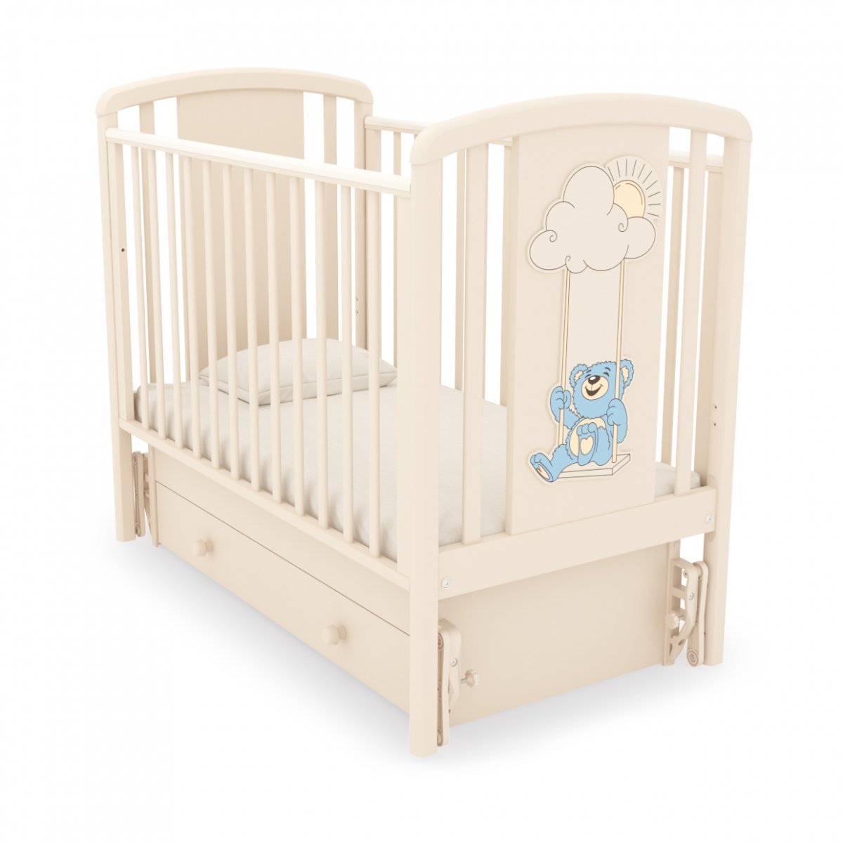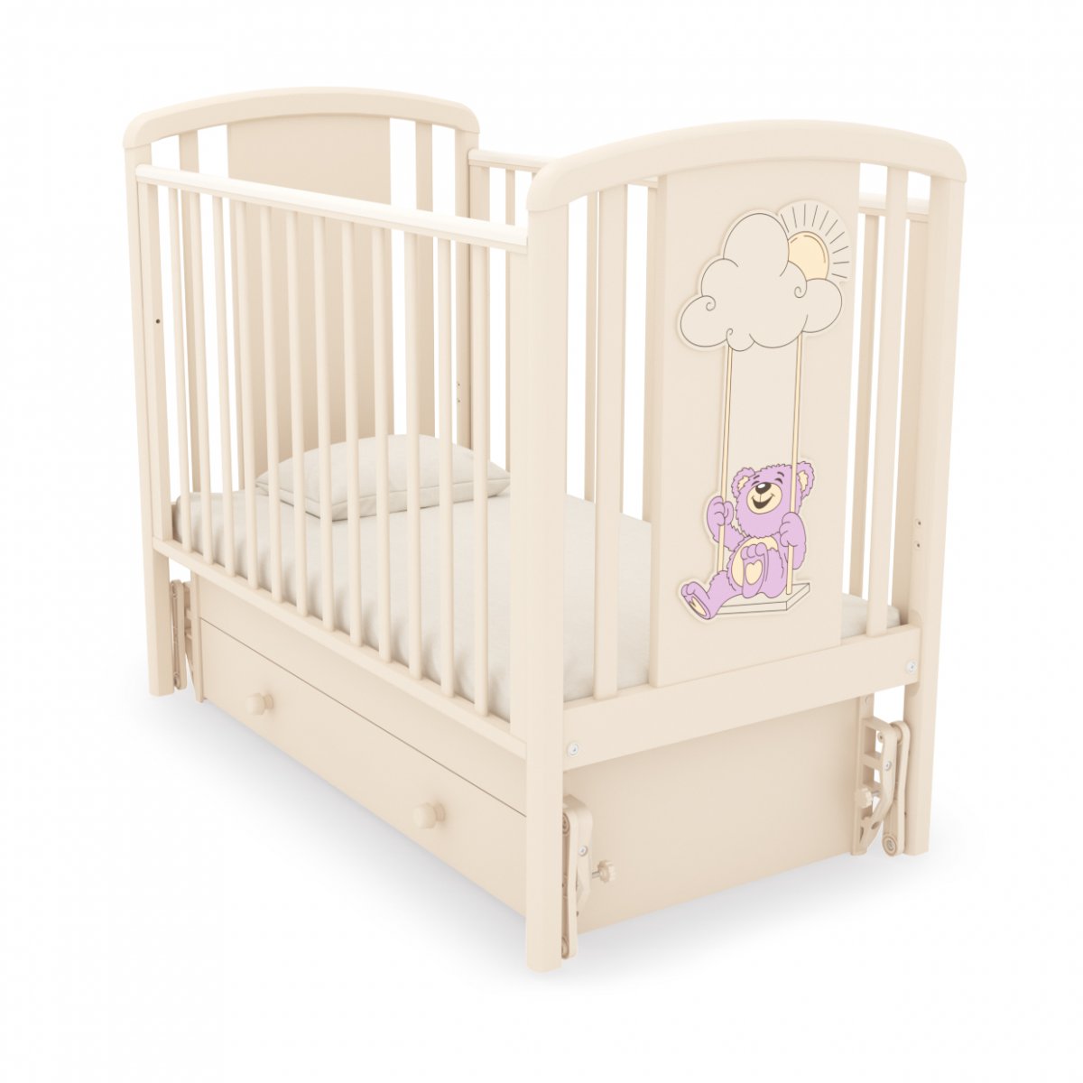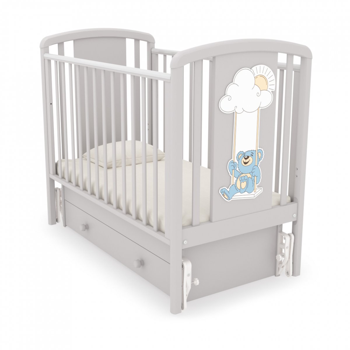 Детская кроватка с универсальным маятниковым механизмом Angela Bella Жаклин Мишка на качелях для детей в возрасте от 0 до 3-х лет. Оригинальная текстильная картинка в виде медвежонка украшает торцевую спинку изделия.