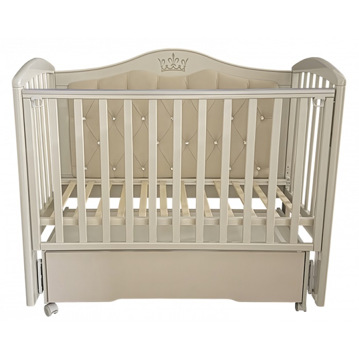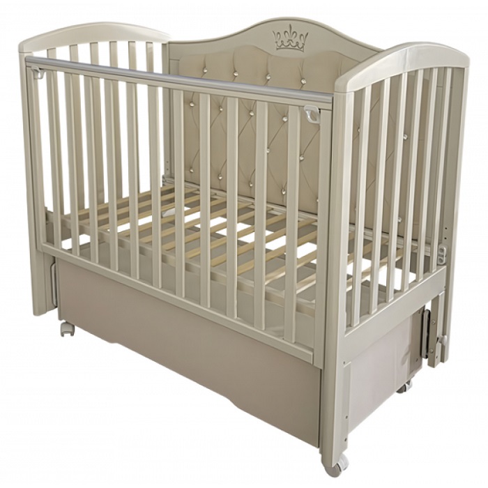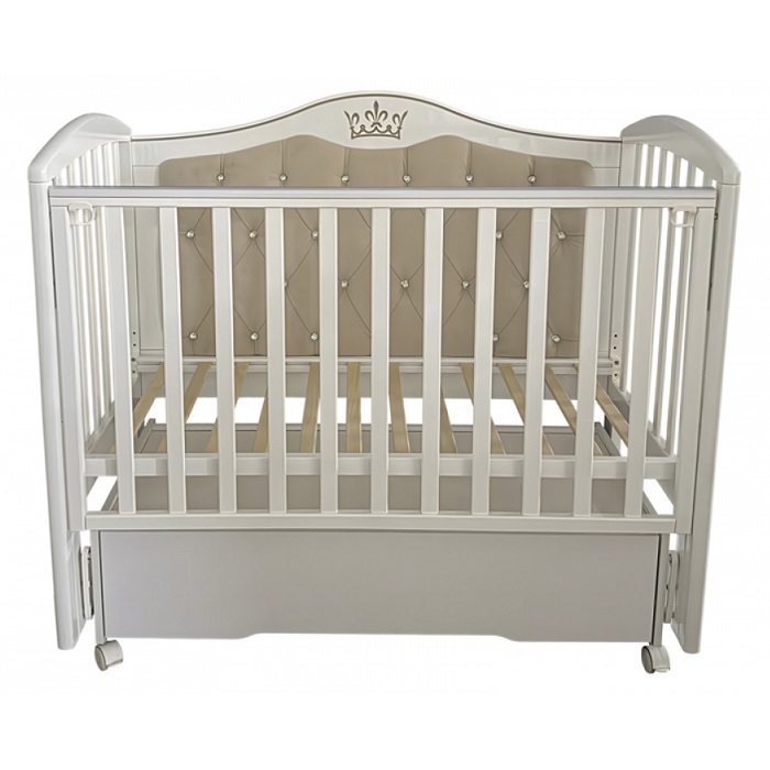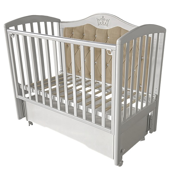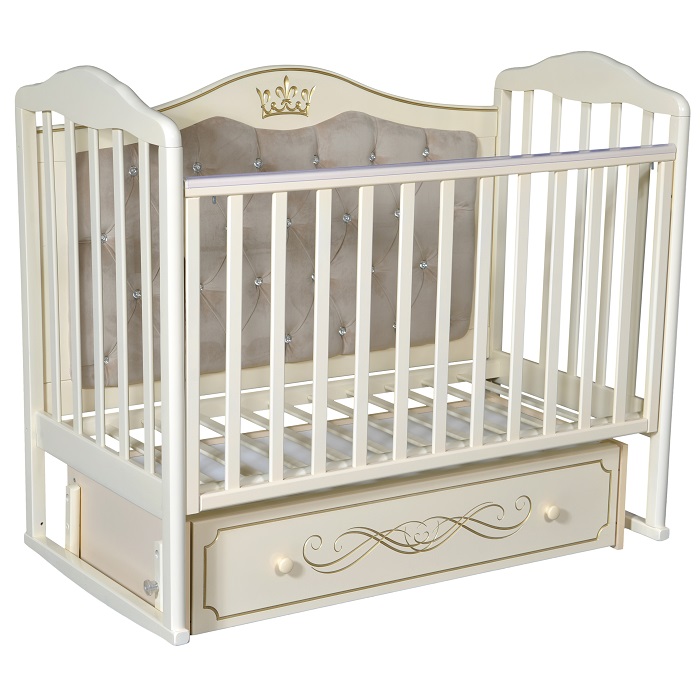 Детская кровать Антел Алита 777 с мягкой стенкой - красивая кровать с мягкой задней стенкой обитой велюровой тканью и патиной с изображением Короны укомплектована универсальным маятником, что позволит Вам собрать кроватку с функцией продольного либо поперечного качания в зависимости от того, как это требуется.