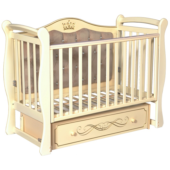 Детская кровать Антел Julia 111 с мягкой спинкой (Антел Джулия 111) - очень красивая, изящная кроватка для ребенка с рождения до 3-4 лет из массива березы. Задняя спинка кровати мягкая, украшена стразами и декоративной резьбой - золотой короной. Боковые стенки кровати фигурные с ламелями, установленными на безопасном расстоянии друг от друга. Кроватка оснащена универсальным маятником, который позволит плавно и тихо покачивать кроватку из стороны в сторону. В зависимости от установки маятник может быть продольного или поперечного качания. Под кроваткой установлен большой и вместительный ящик закрытого типа.