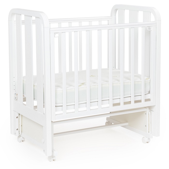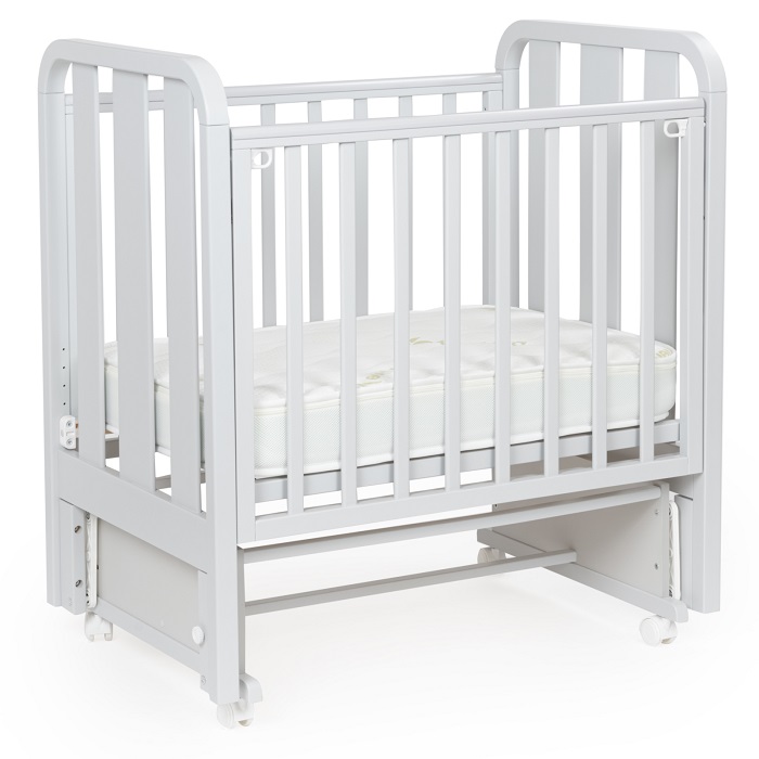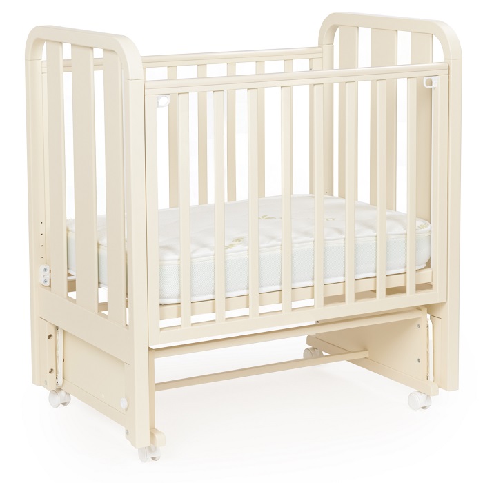Это функциональная кроватка, продуманная до мелочей, это максимальный комфорт и безопасность для вашего малыша. Каркас кроватки выполнен из массива берёзы. Для удобства родителям, боковая стенка кроватки регулируется по высоте. Модель оборудована маятником для плавного качания ребенка.
