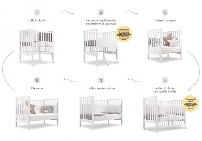 Детская кровать Erbesi Evolution (Ербеси еволютион) - кроватка-трансформер от итальянского производителя для ребенка с рождения до 4 лет. Эта кроватка может использоваться как маленькая и уютная колыбелька на колесах, приставная кроватка, полноценная кроватка 125х65 см с четырьмя бортиками, кроватка-диванчик.
