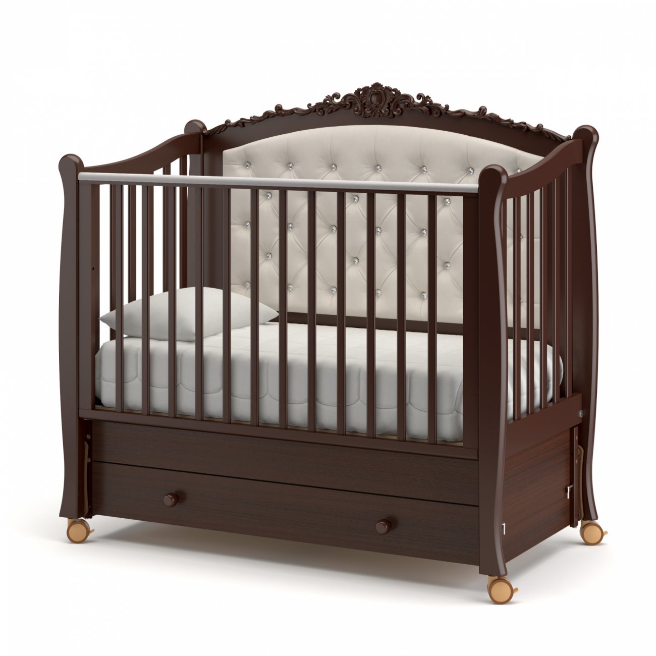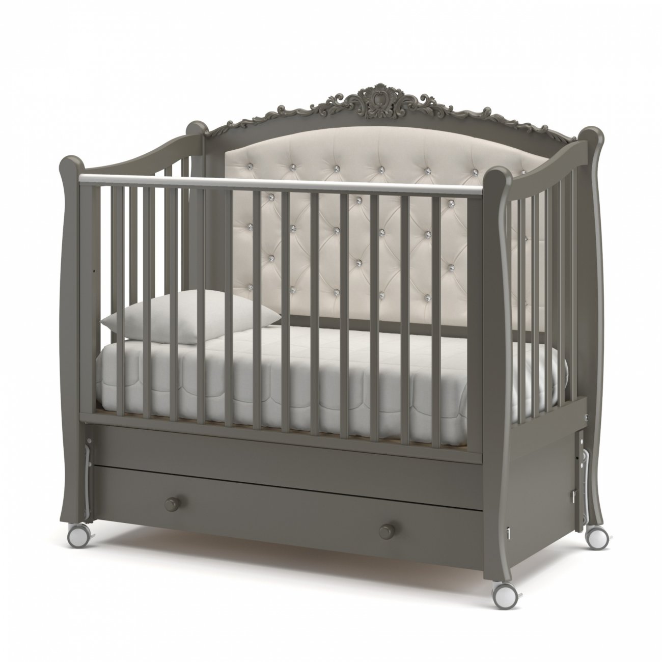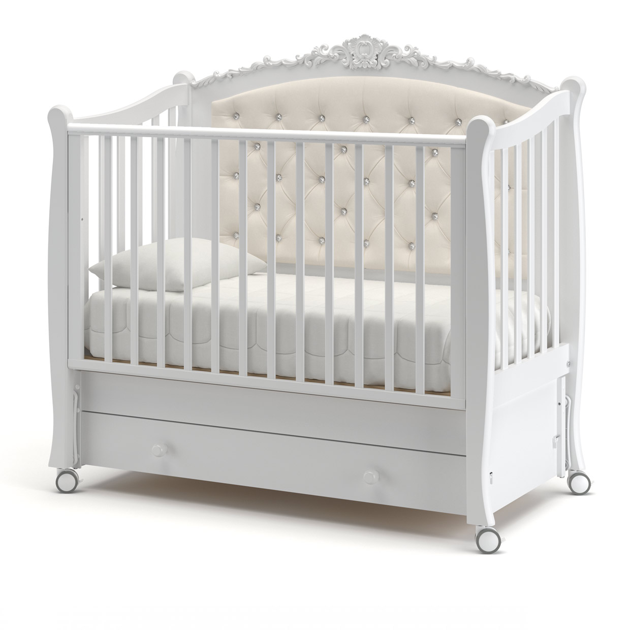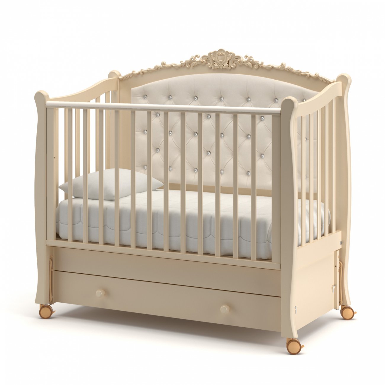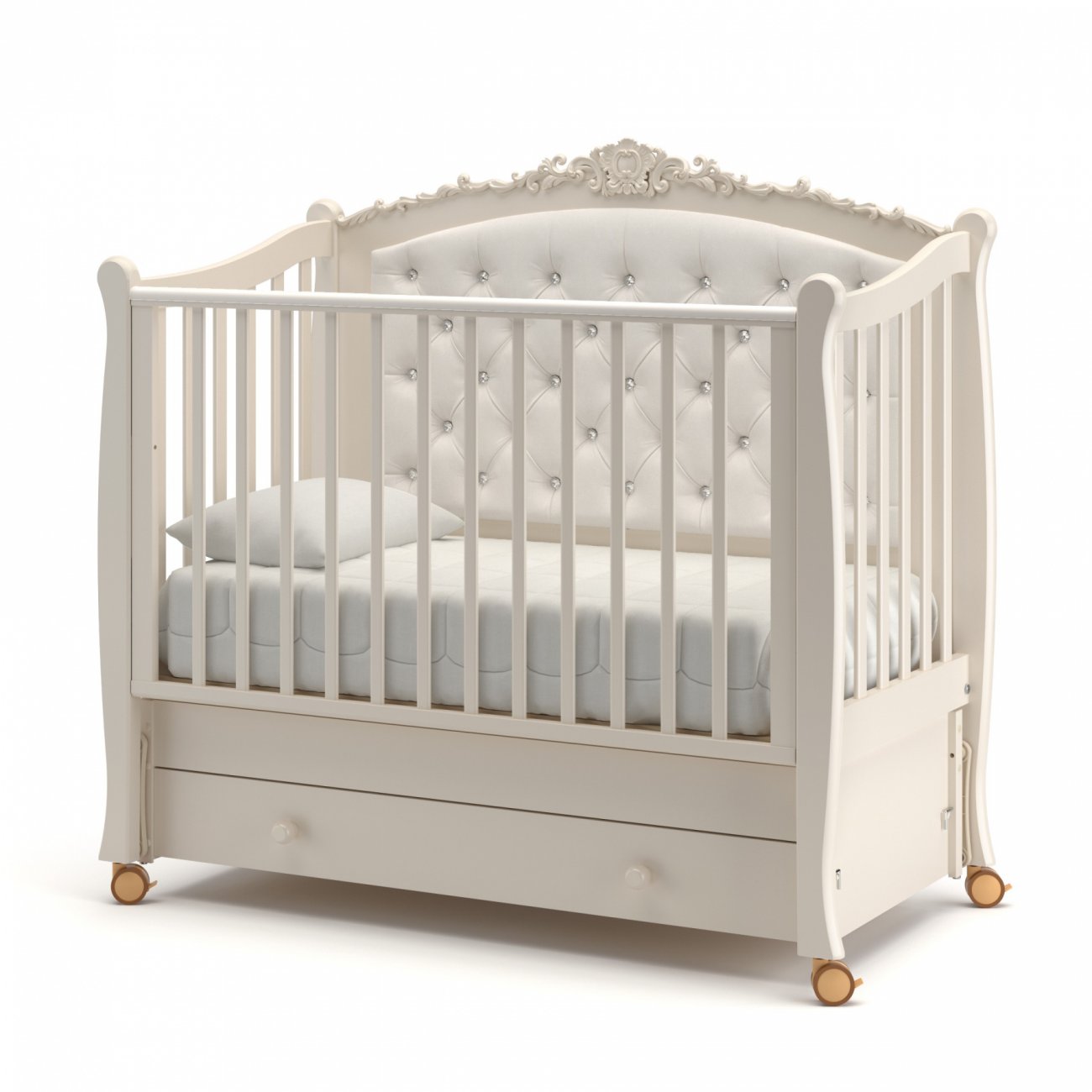 Кровать Гандылян Жанетт - по-настоящему королевская кроватка для ребенка с рождения до 3-4 лет. Ее дизайн завораживает и притягивает. Невероятно красивая задняя спинка с мягкой обивкой и элегантным орнаментом в верхней части. Мягкая спинка выполнена из качественного, гипоаллергенного материала и украшена стразами. Модель представлена в 6 расцветках. Это и классические расцветки как белый, слоновая кость, шоколад, так и необычные, как например, муссон или белая ночь.