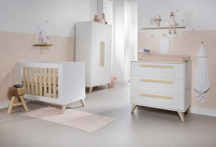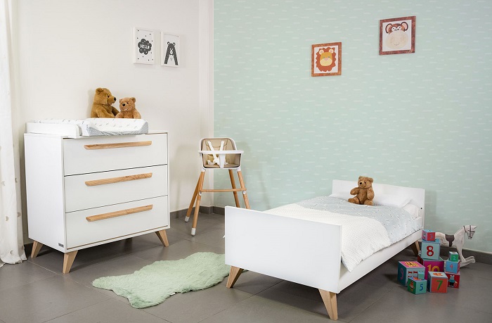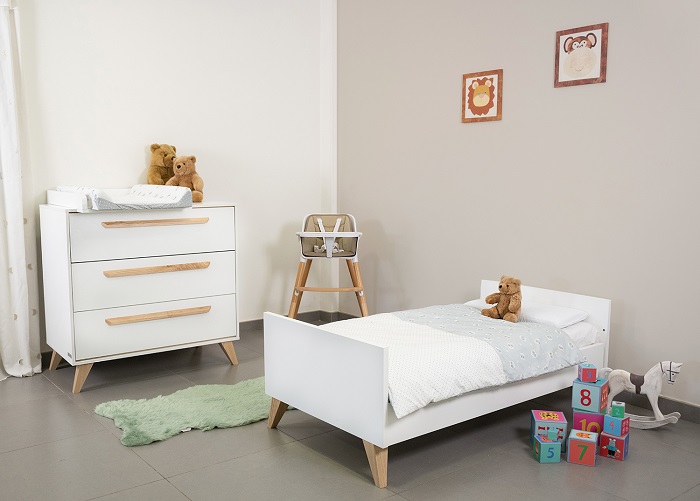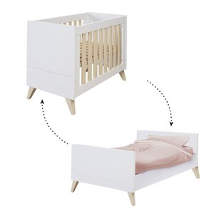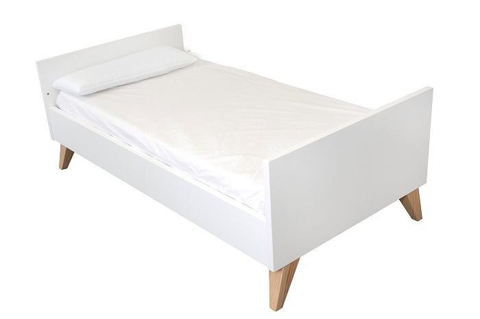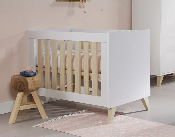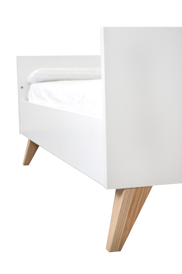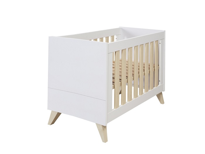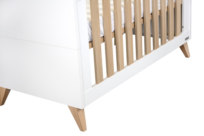 Кровать выполнена в белом цвете с ламелями в натуральном цвете. Благодаря такому сочетанию кроватка смотрится очень светлой и уютной, и к ней легко подобрать другие предметы мебели и аксессуары.