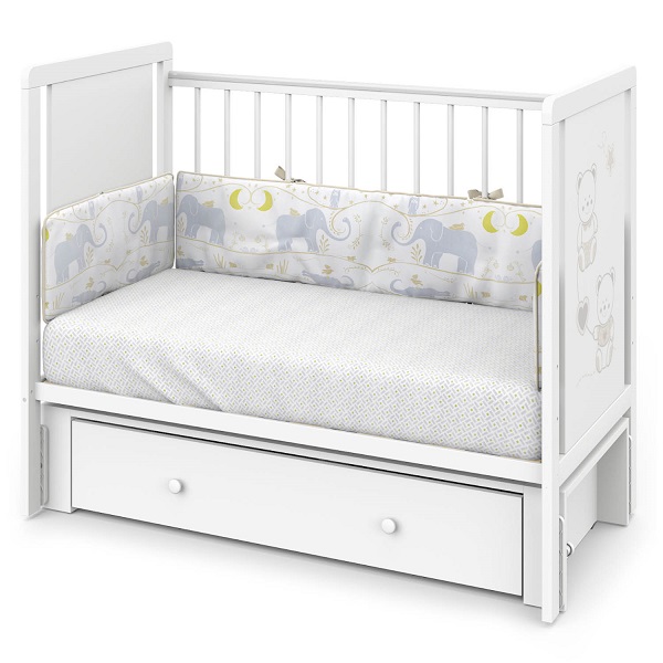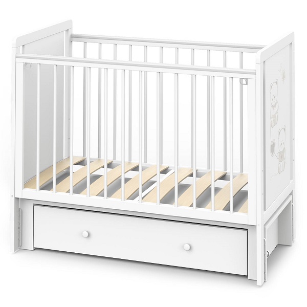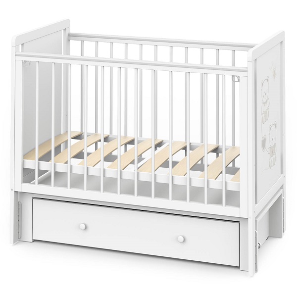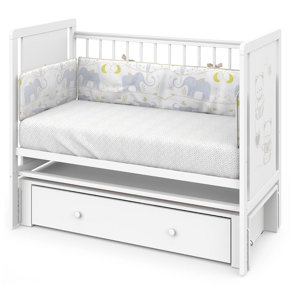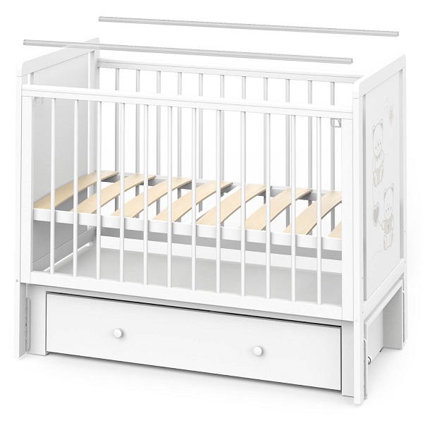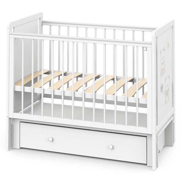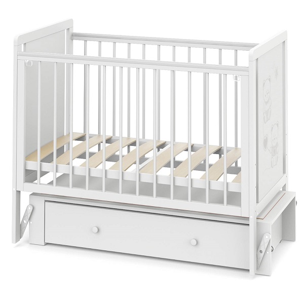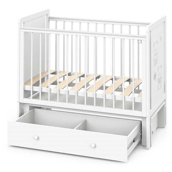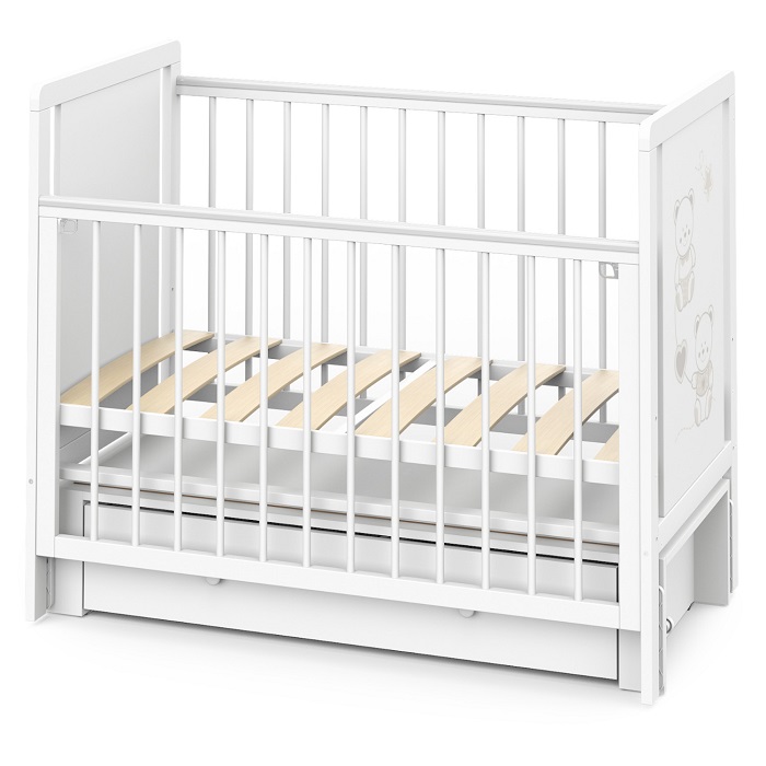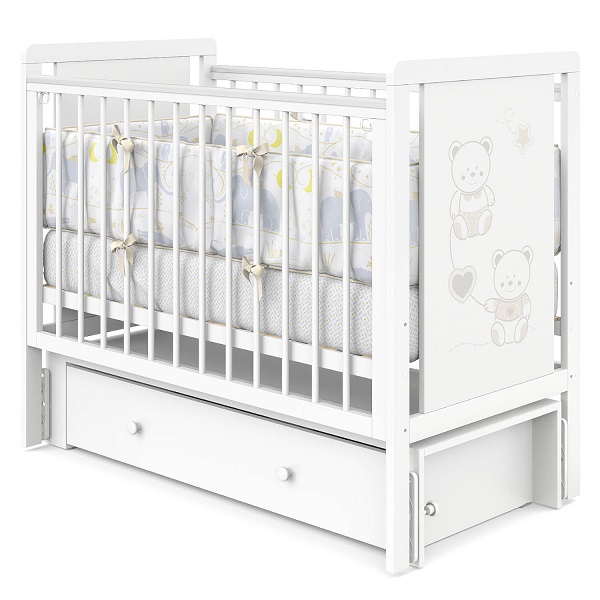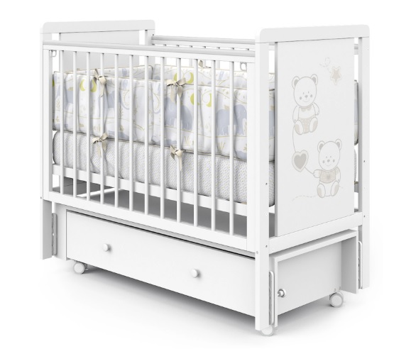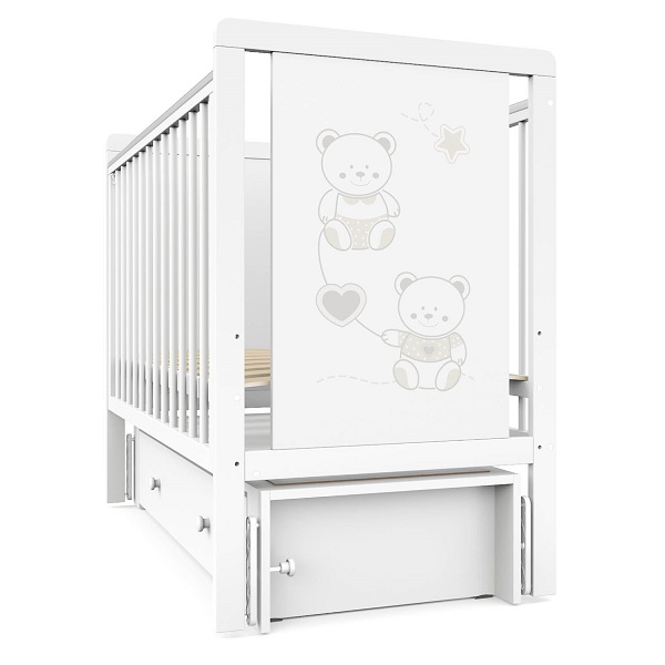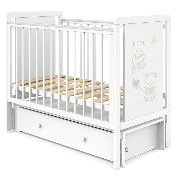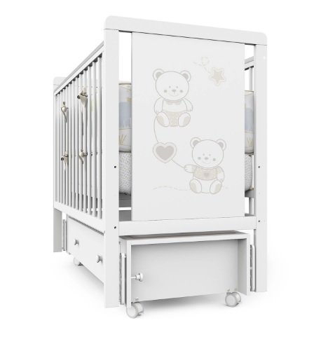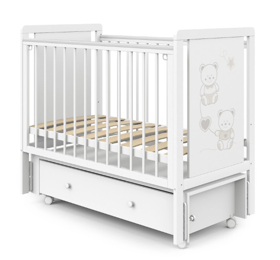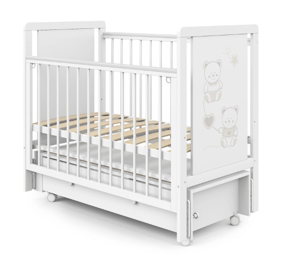 Кроватка отличается стильным дизайном и высокой практичностью. Белый универсальный цвет гармонично впишется в любой интерьер, а рисунок милых мишек на боковом торце добавит детской комнате уюта.
