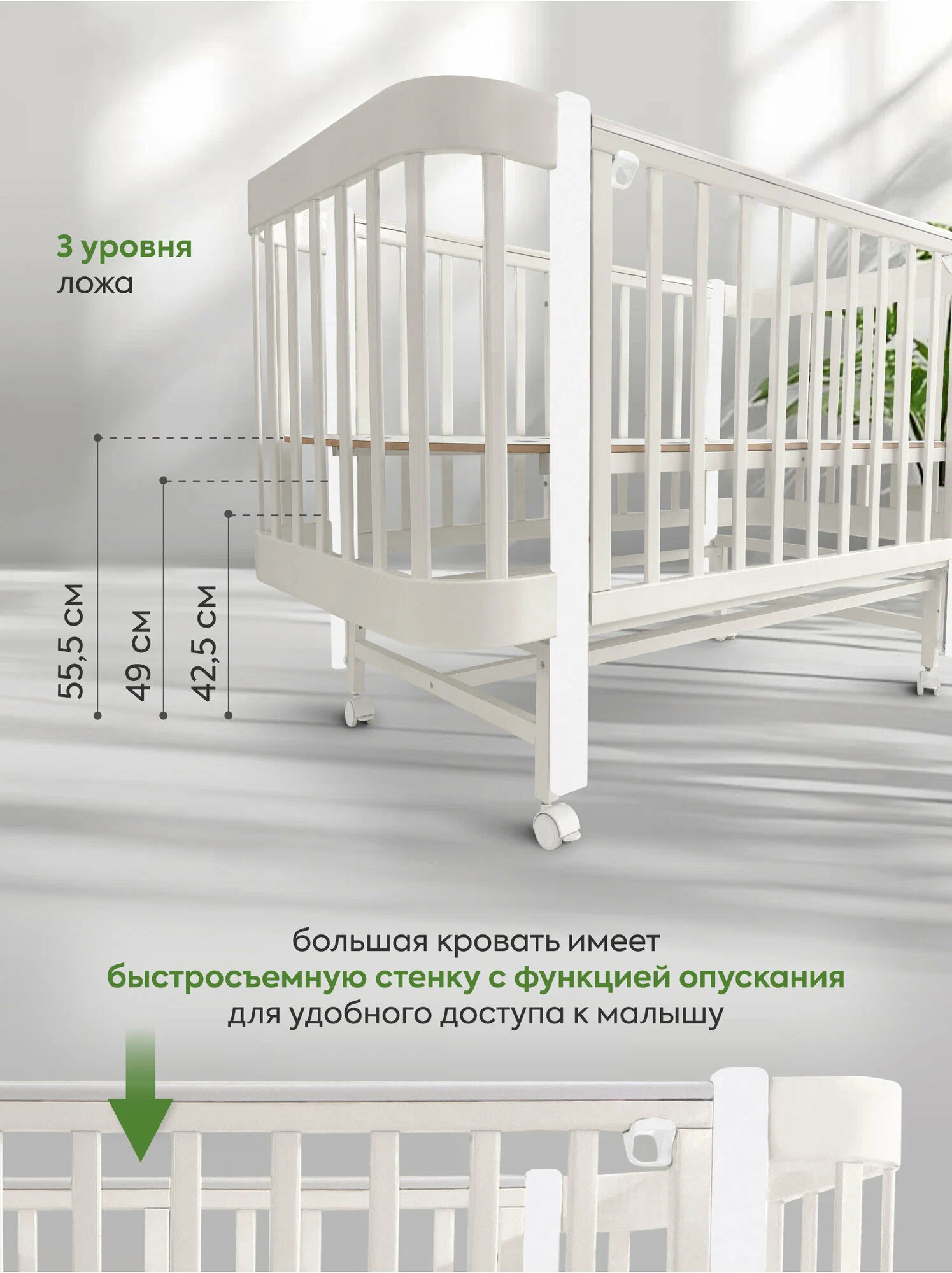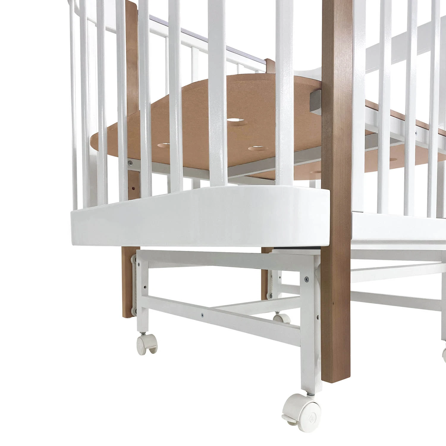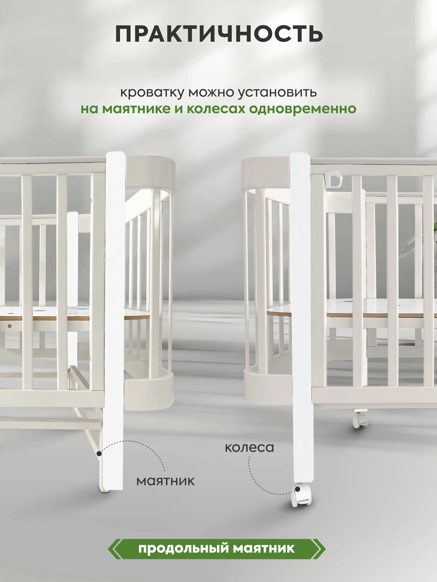 В комплекте с кроваткой идут колеса и продольный маятник. Кроватку можно устанавливать как отдельно с колесами или с маятником, так и маятник с колесами одновременно. Продольное качание позволит родителям более быстро успокаивать и укладывать ребенка на сон.