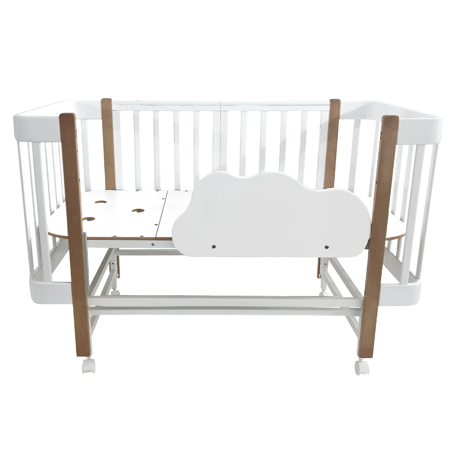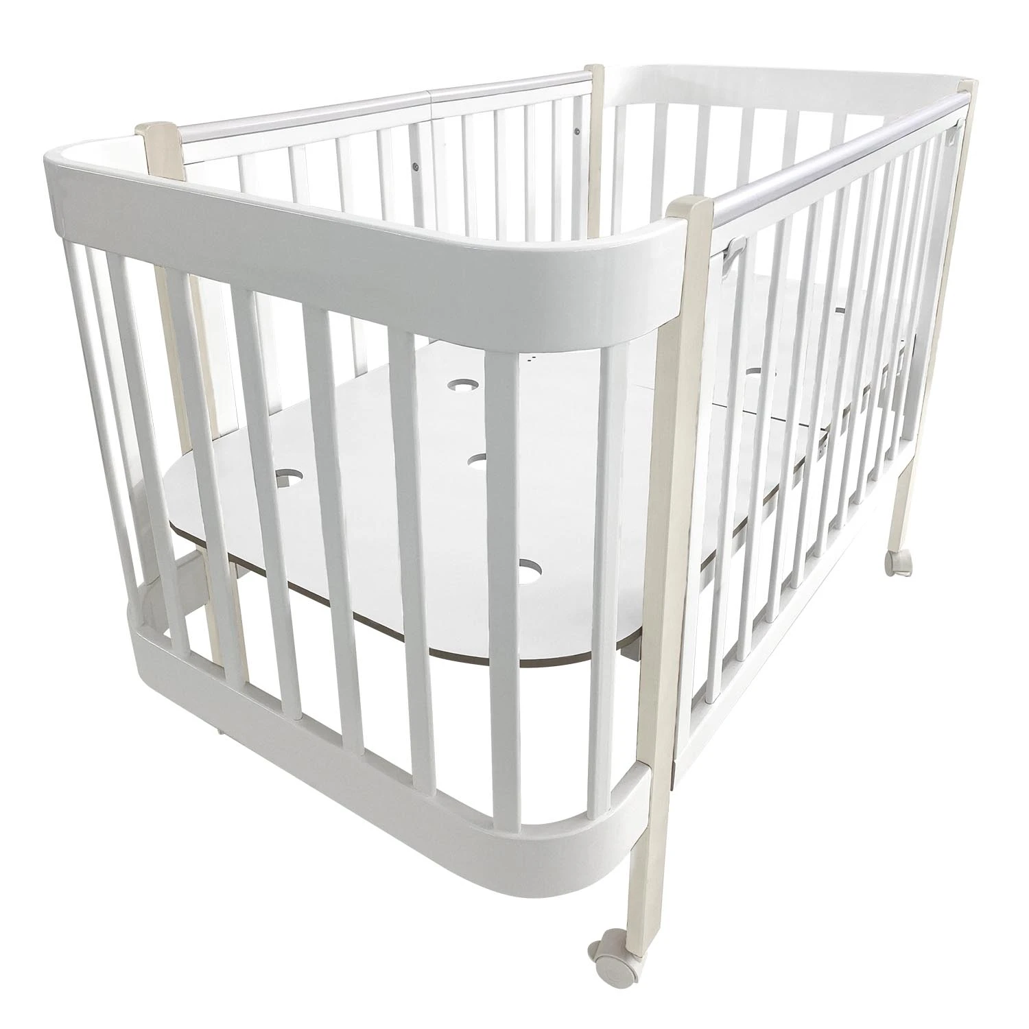 Для удобства родителей спальное ложе регулируется по высоте в 3 положениях. Передний бортик в маленькой кроватке снимается с помощью инструментов. Овальная кроватка с расширением 140 см оснащена уже быстросъемной стенкой и дополнительным бортиком безопасности для подросшего ребенка в виде облачка.