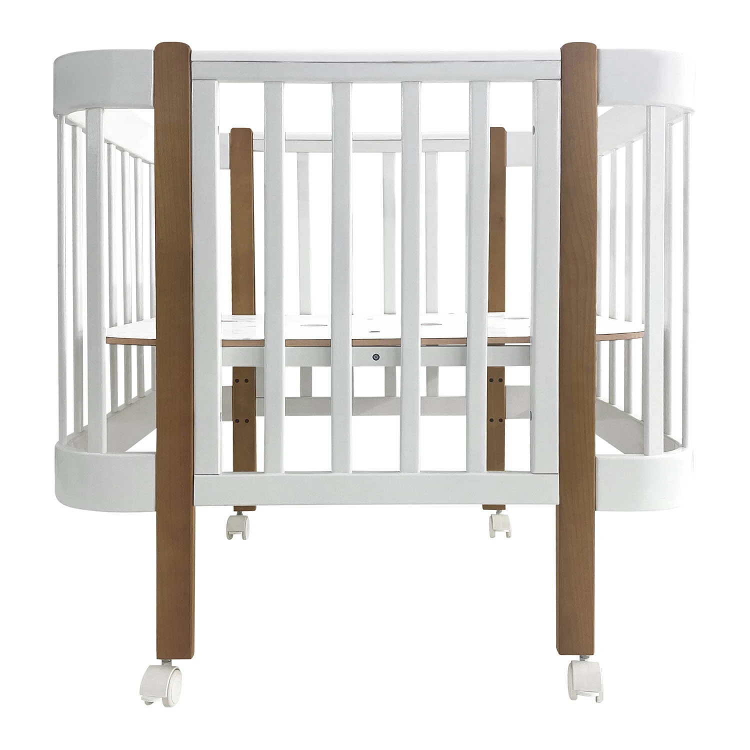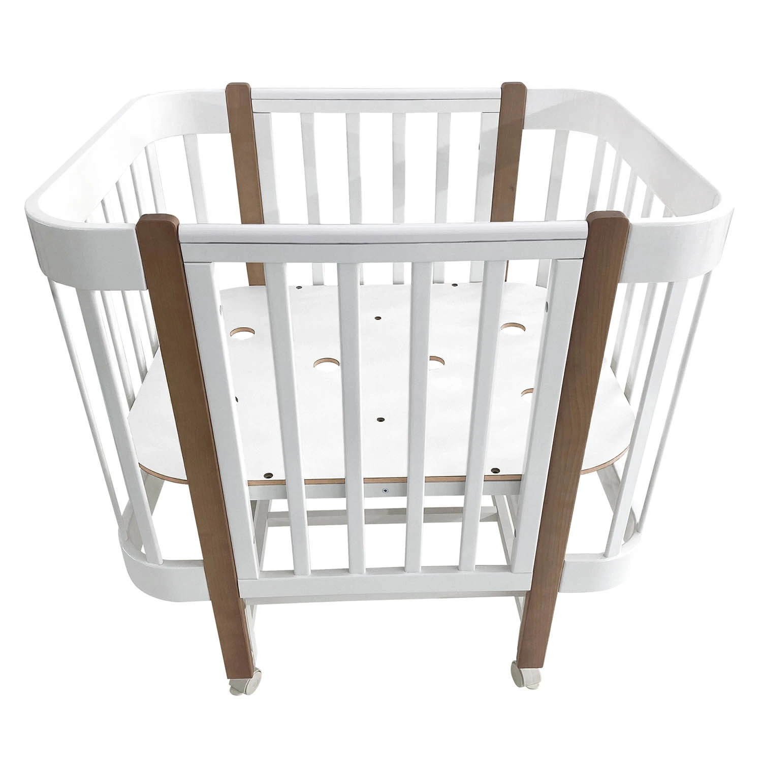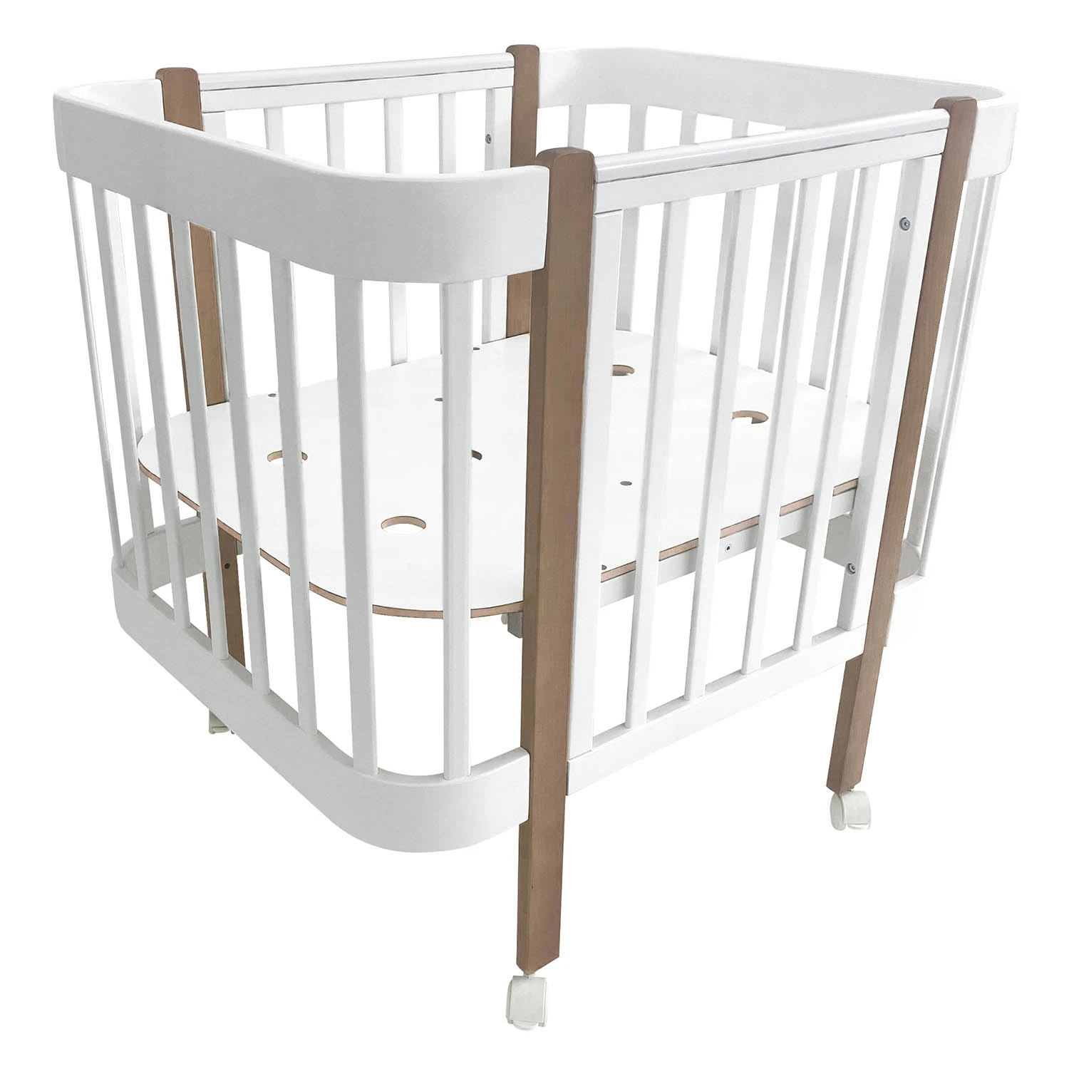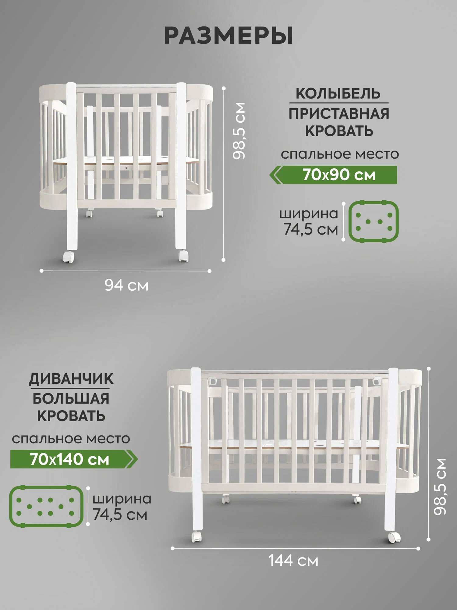 - Трансформация 4-в-1: колыбель 90×70 см, большая кровать 140×70 см, приставная кровать 90х70 и диванчик 140×70.