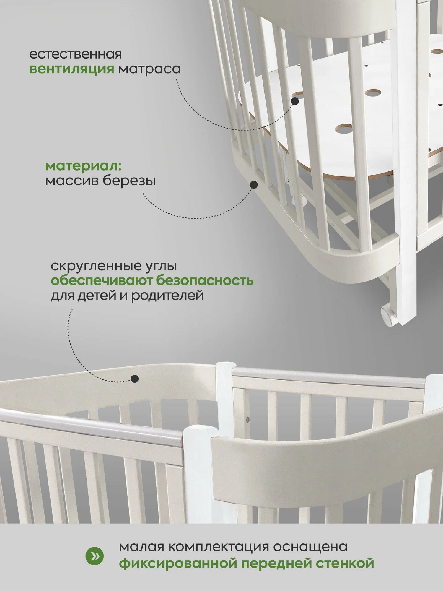 Кроватка рассчитана на долгий период и может предложить четыре варианта использования: колыбель для новорожденного 90×70 см, большая кровать 140×70 см, приставная кровать 90х70 и диванчик 140×70. Кровать выполнена из надежного каркаса из массива березы, дно выполнено из фанеры с вентиляционными отверстиями.