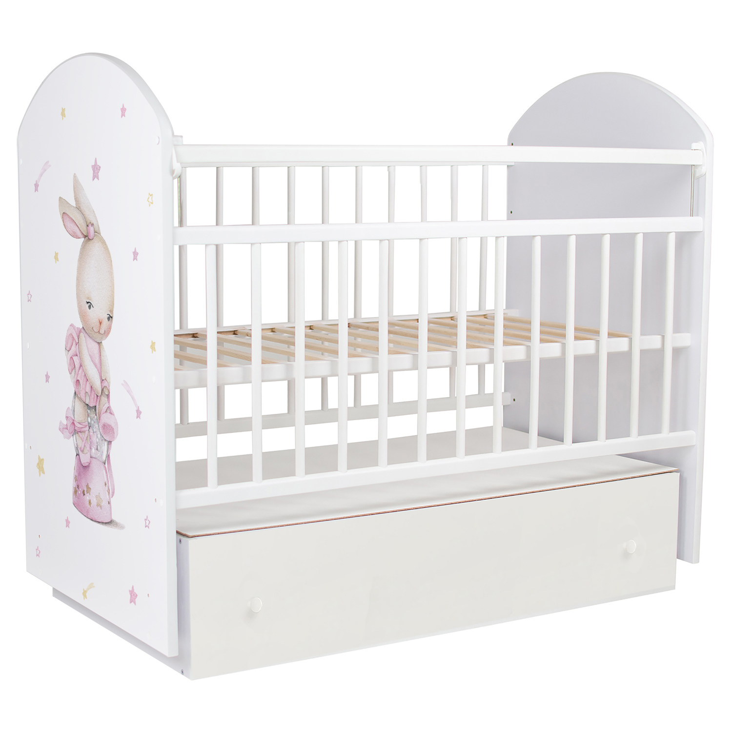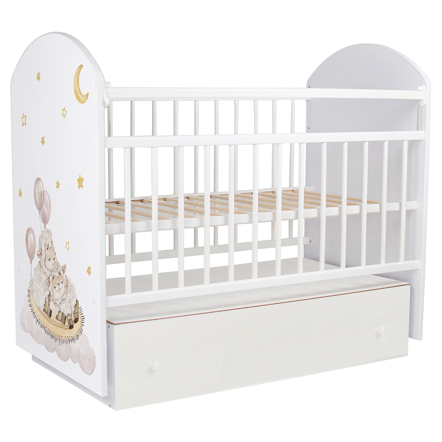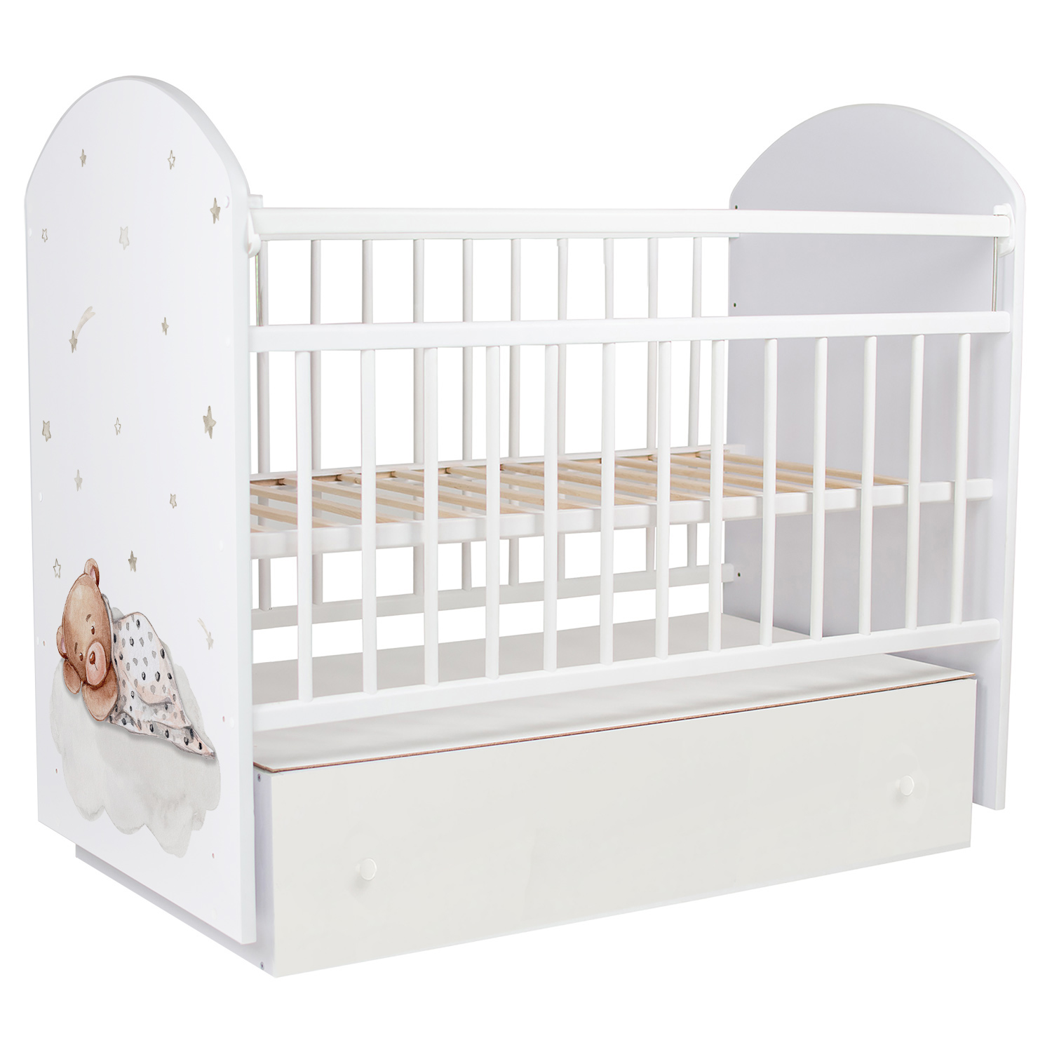 Кроватка оснащена маятником, силиконовыми накладками и вместительным ящиком для вещей.