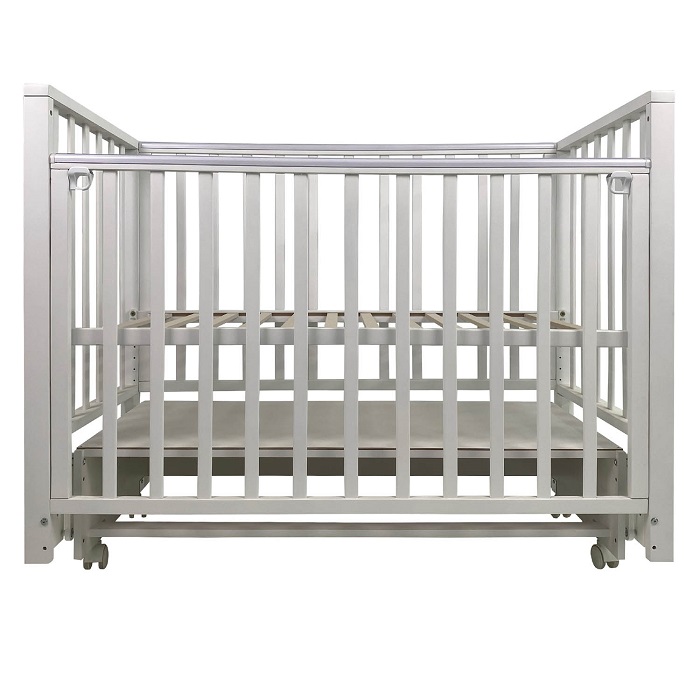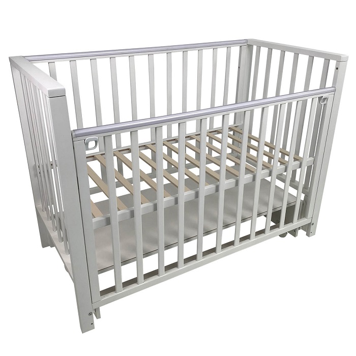 Передний бортик - автостенка. С помощью нажатия 2 курков вы сможете легко отрегулировать бортик по высоте или быстро снять передний бортик. Без бортика кроватку можно использовать как диванчик для уже подросшего ребенка или как приставную кроватку для совместного ночного сна.