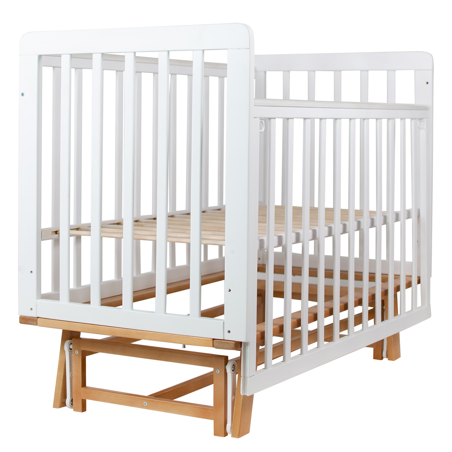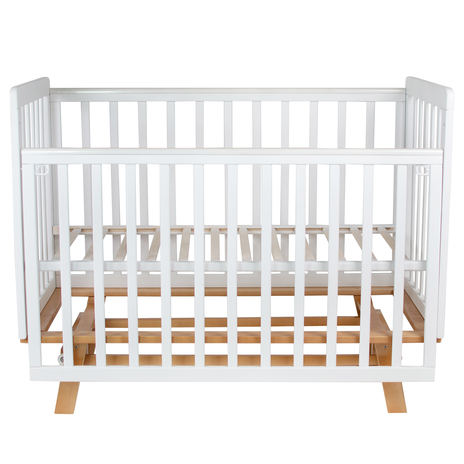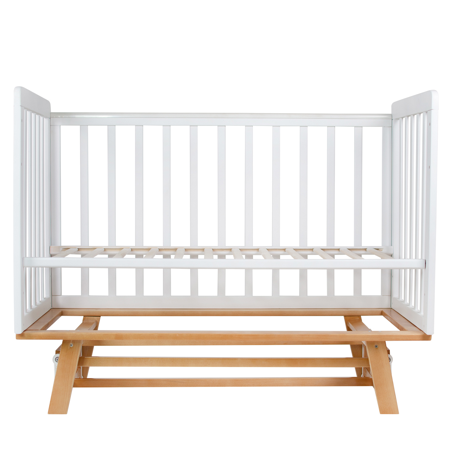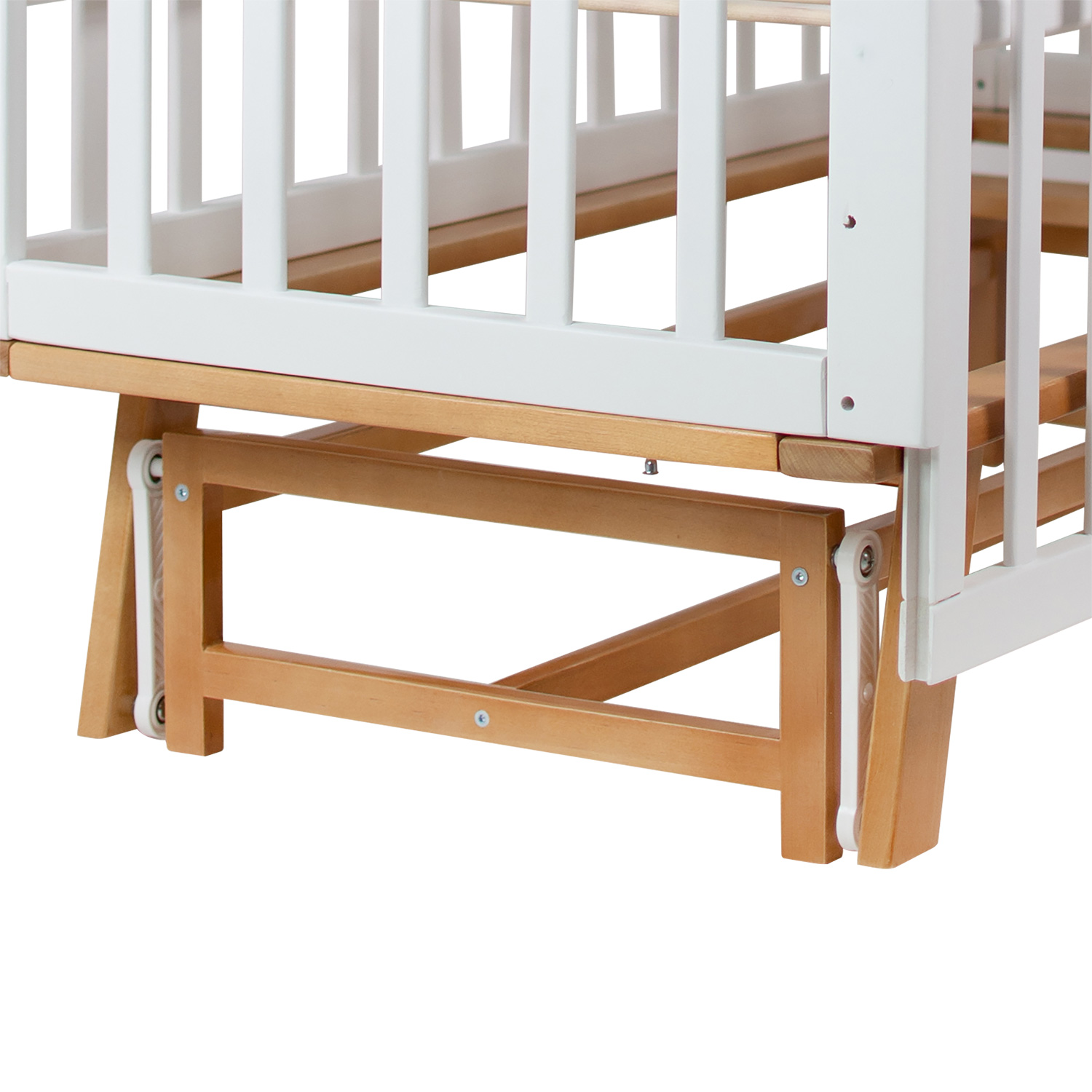Кроватка оснащена продольным маятником. Он поможет плавно и тихо качать кровать вместе с ребенком, помогая малышу успокоиться и быстрее уснуть.
