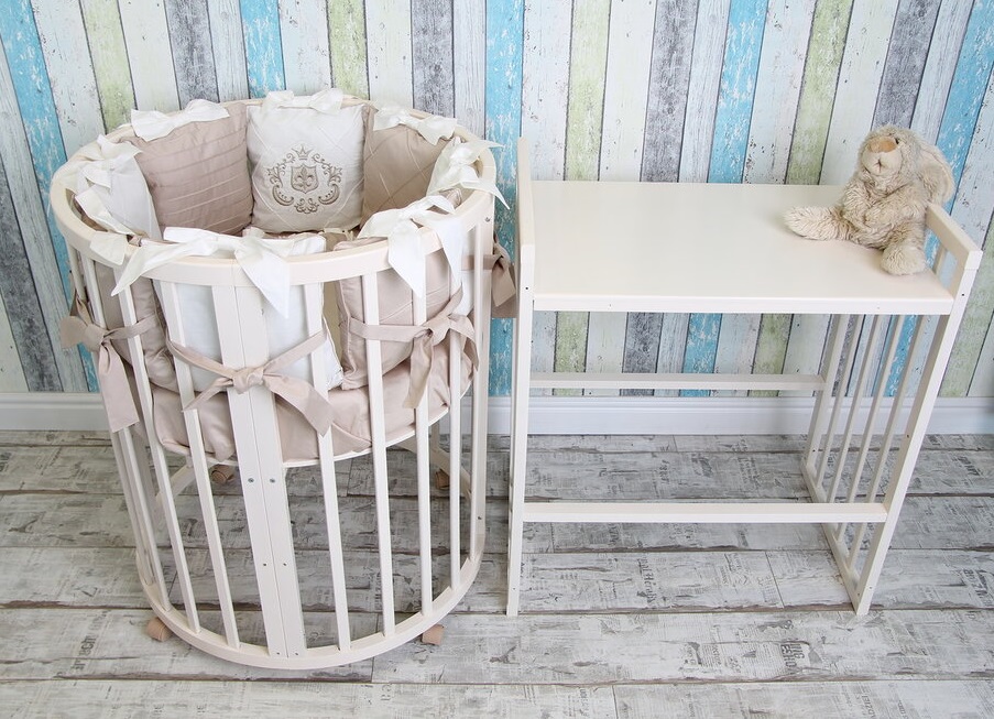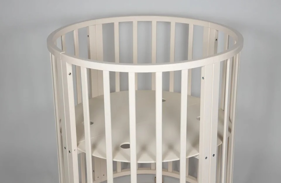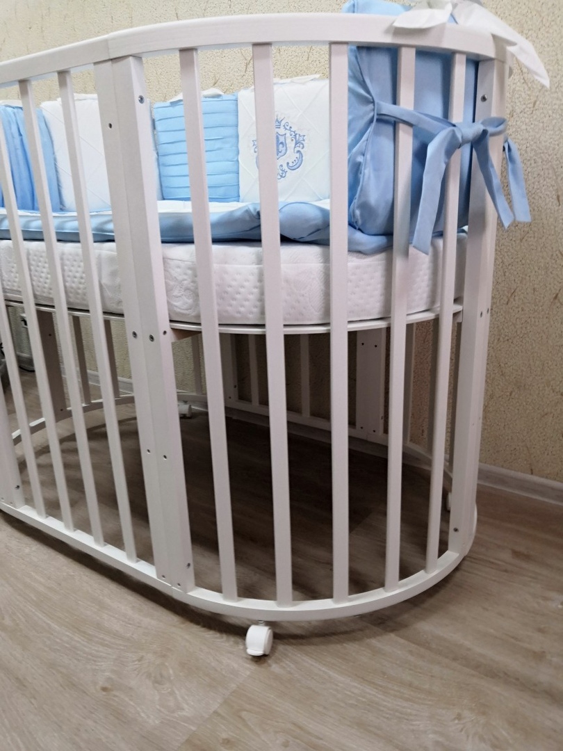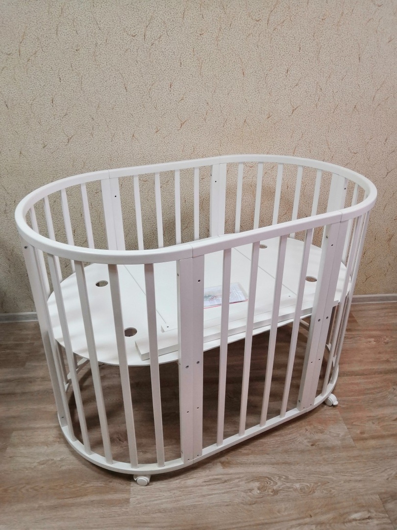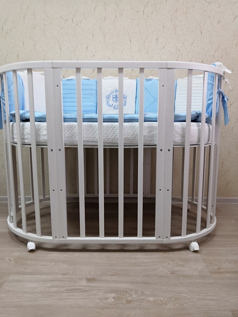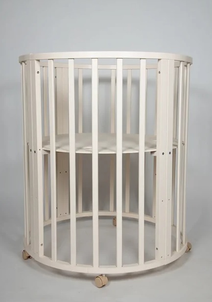 - Трансформация по мере роста ребенка в круглую кроватку с пеленальным столиком с одной полочкой (спальное место 75 *75 см), приставную кровать, овальная кровать (спальное место 125*75 см), овальный диван, манеж (спальное место 125*75 см), стол и 2 стула.