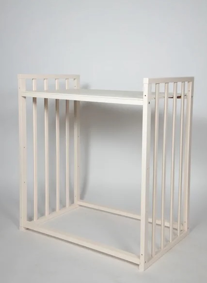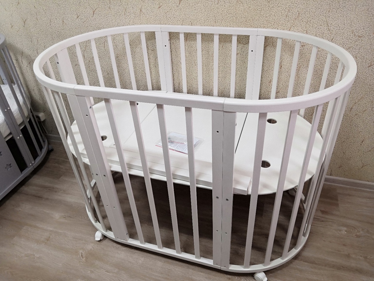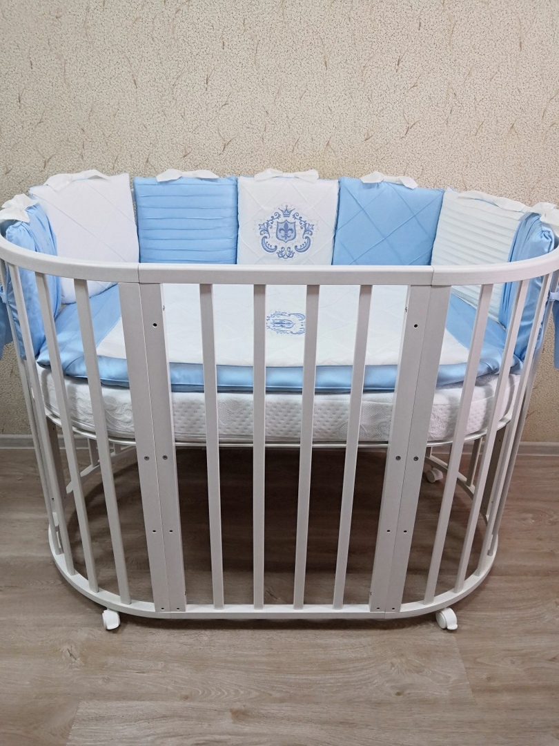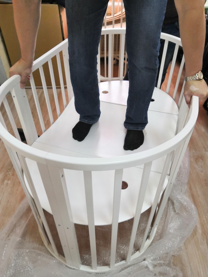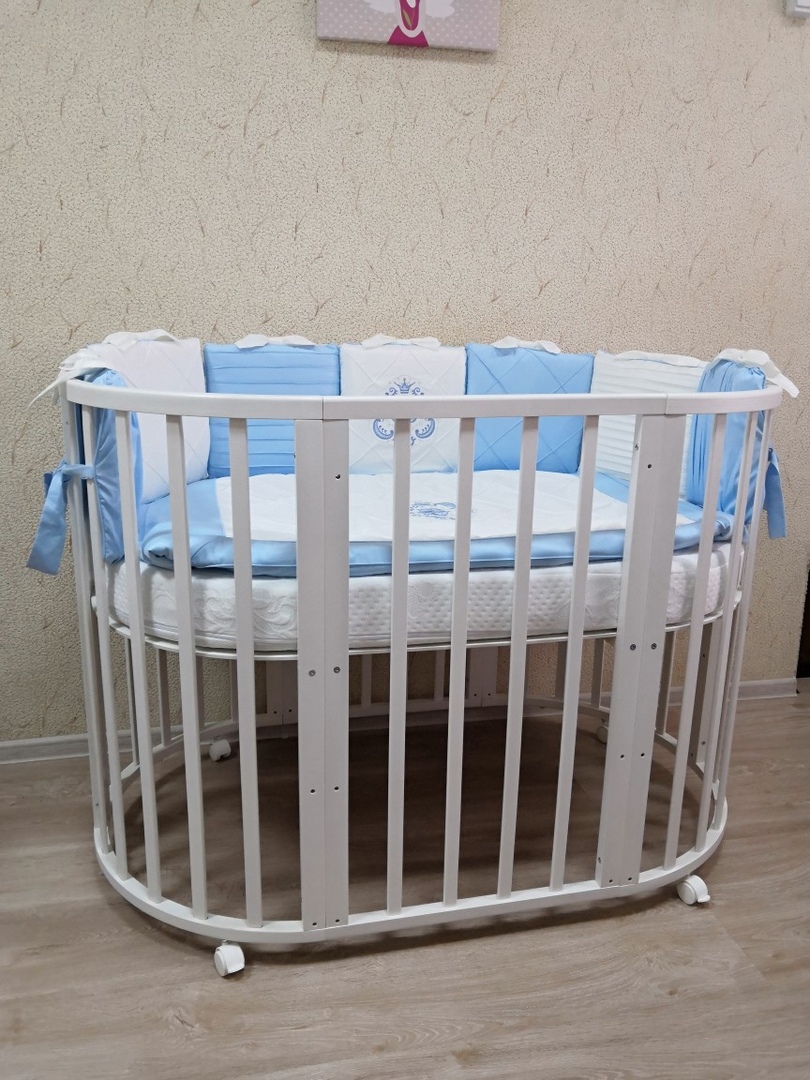 - Трансформация по мере роста ребенка в круглую кроватку с пеленальным столиком с одной полочкой (спальное место 75 *75 см), приставную кровать, овальная кровать (спальное место 125*75 см), овальный диван, манеж (спальное место 125*75 см), стол и 2 стула.