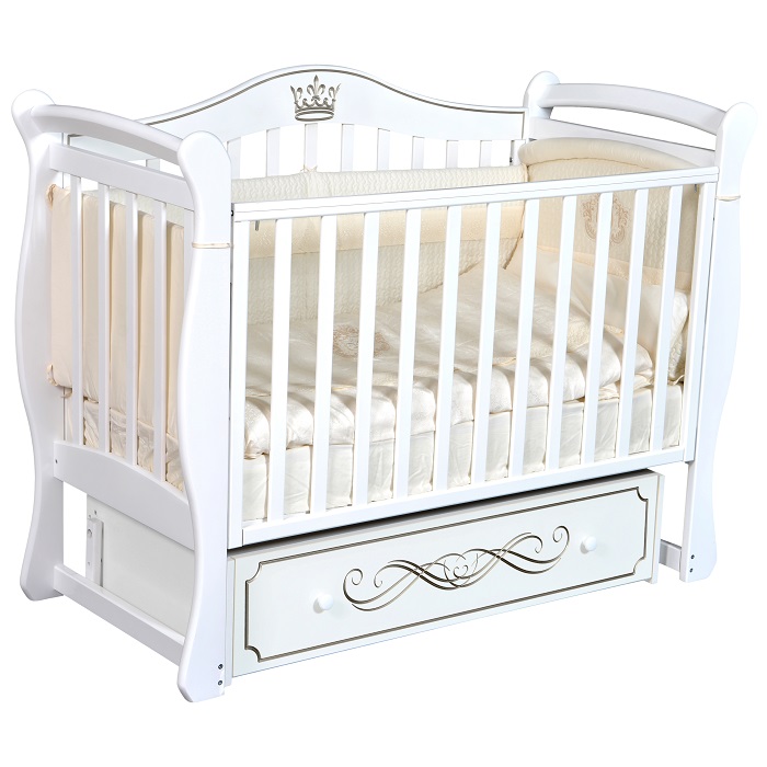 Данная модель оснащена универсальным маятником, который, в зависимости от ваших предпочтений, может плавно и бесшумно качать кровать вдоль и поперек. Такие качания успокаивают ребенка, помогают быстрее уснуть и спать более крепко. При необходимости маятниковый механизм легко фиксируется.