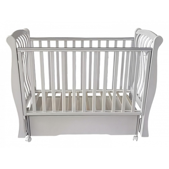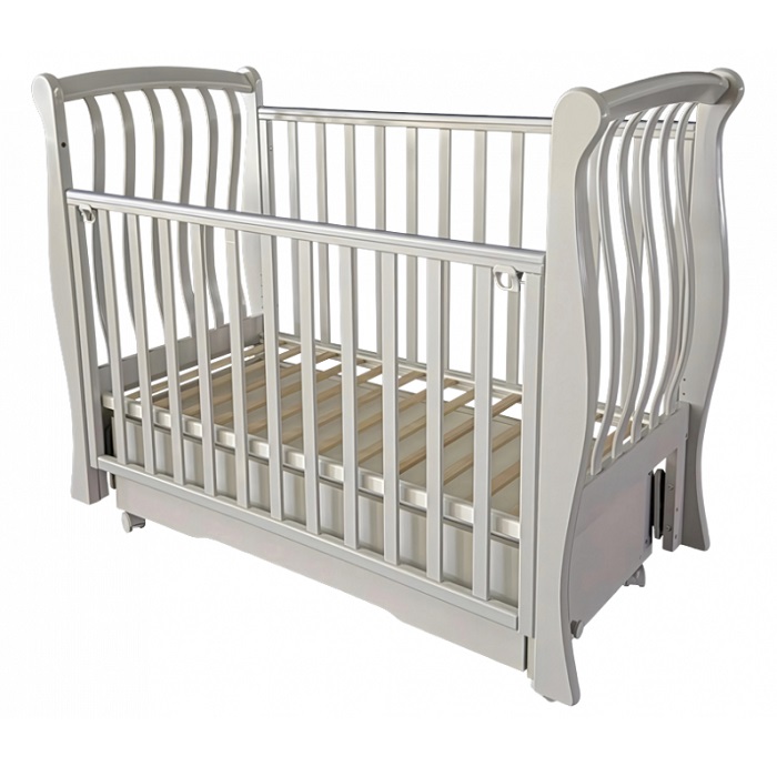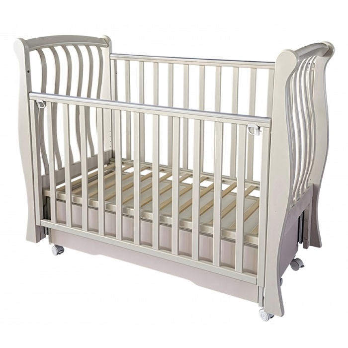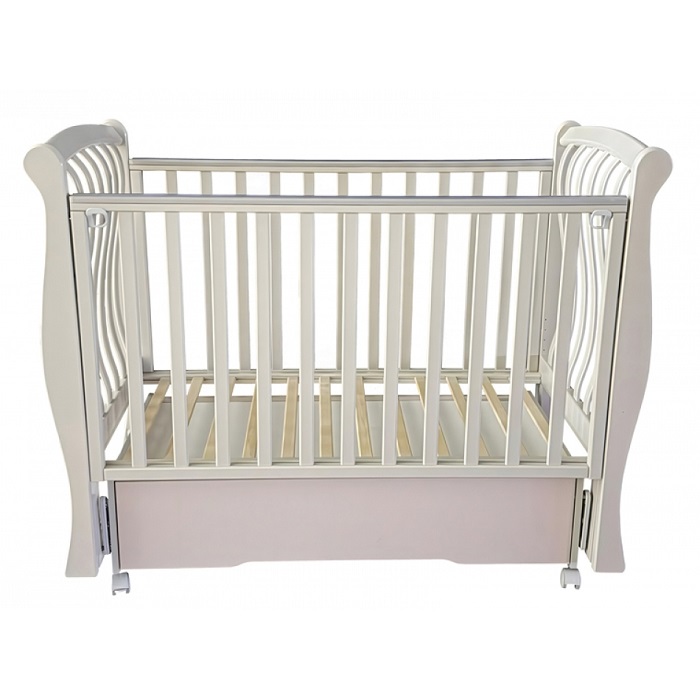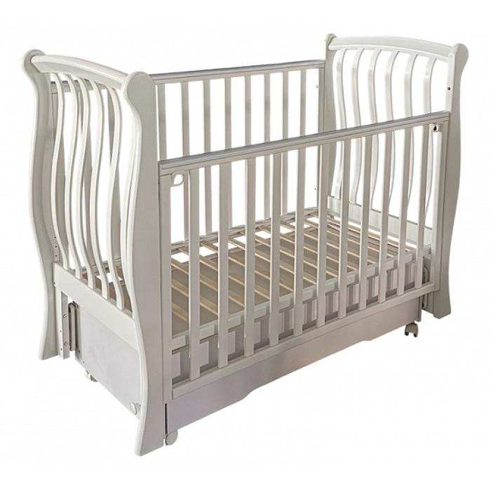 Кровать Кедр Виола3 (Viola 3) - элегантная кровать для ребенка с рождения до 4 лет с изогнутыми боковинами. Кровать оснащена универсальным маятником с колесами, который в зависимости от установки может быть попеченного или продольного качания. Маятник позволит кроватки плавно покачивать из стороны в сторону убаюкивая, успокаивая и помогая ребенку уснуть. Так же в кроватке для маминого удобства есть опускающаяся стенка, 2 положения матраса по высоте. Чтобы обезопасить ребенка во время прорезывания зубов предусмотрены силиконовые накладки на бортики. Под кроваткой есть вместительный ящик для вещей.