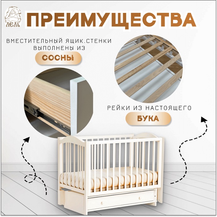 Основной материал кроватки - кавказский бук. Это натуральный, экологичный и один из лучших материалов для детской мебели. Кроватка из бука отличается надежностью и долговечностью, а за счет красивой фактуры дерева, кроватка смотрится красиво и более дорого. Плавные линии, красивые изгибы и классические расцветки дополнительно придают кроватке элегантность и позволяют использовать модель в практически любом дизайне.