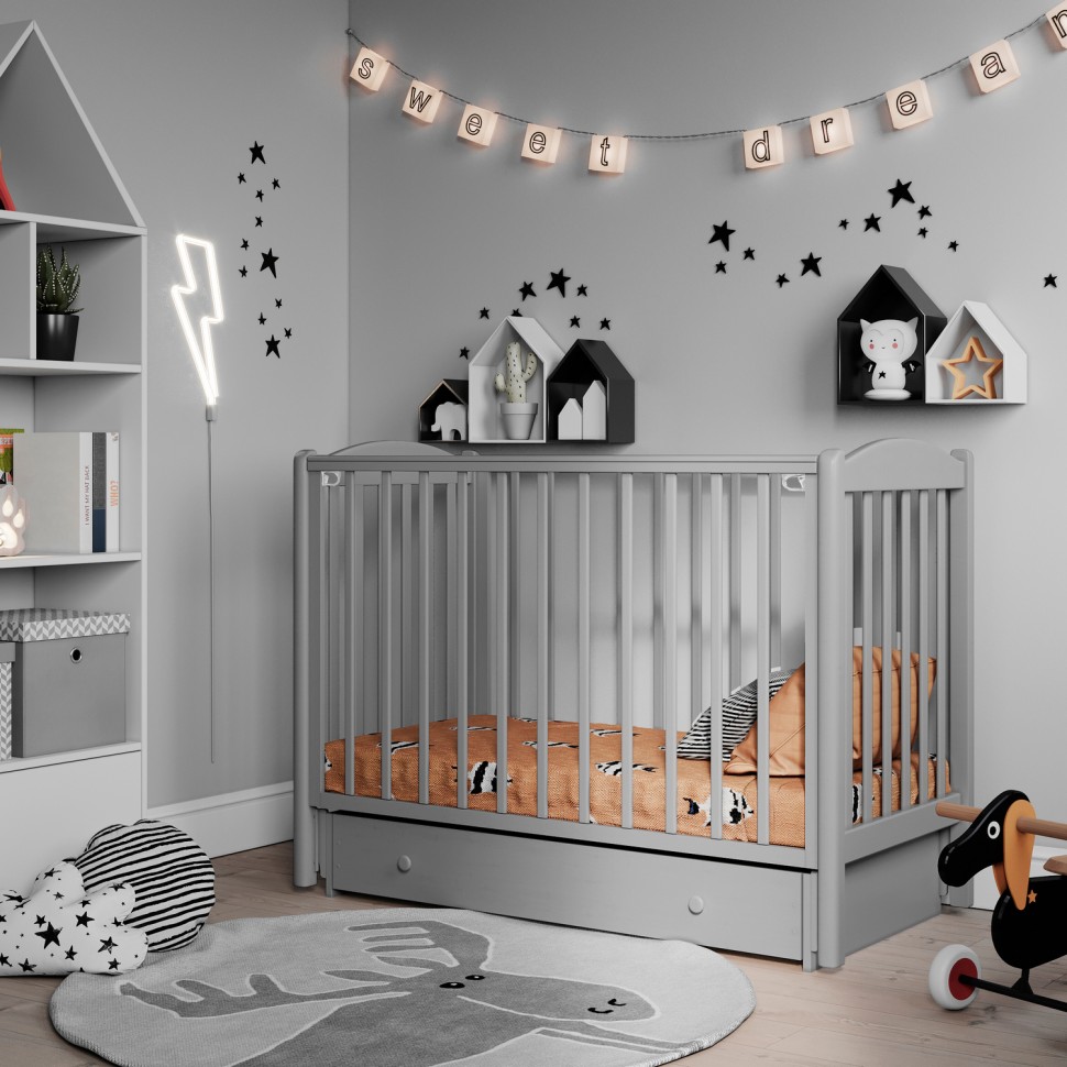 Большой ящик под кроваткой с полным выдвижением позволит маме удобно хранить спальные принадлежности для малыша в легком доступе.