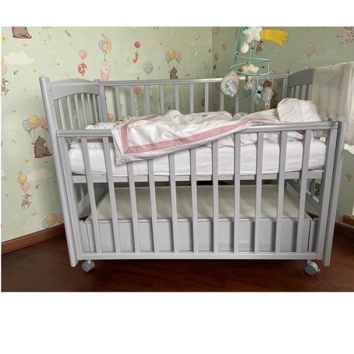 Передний бортик кроватки легкосъемный. Благодаря курковому механизму, бортик регулируется или снимается полностью за несколько секунд. Вы сможете с легкостью превратить кроватку в приставную или в диванчик для подросшего ребенка без инструментов.