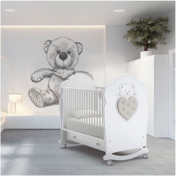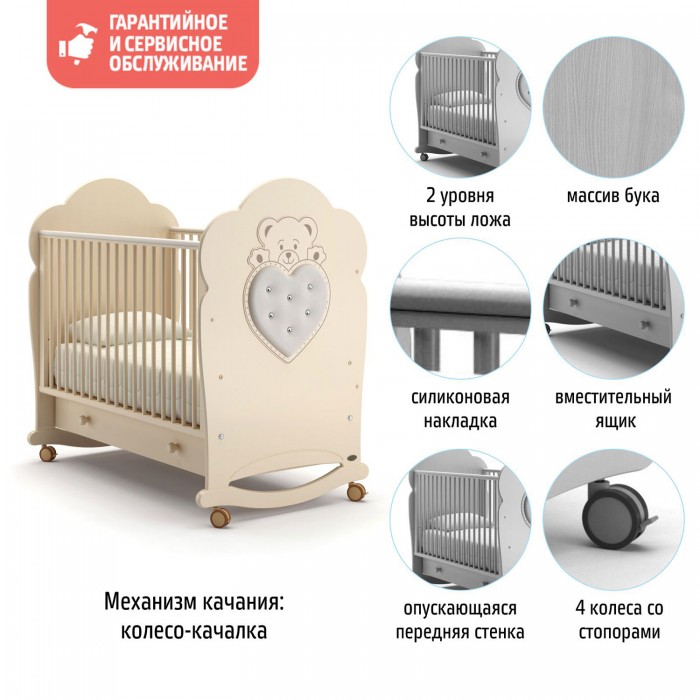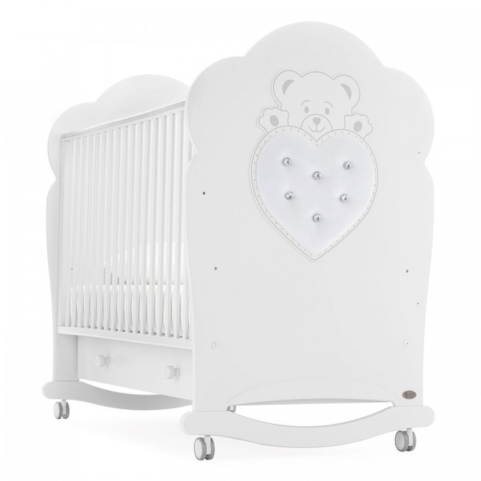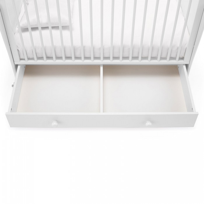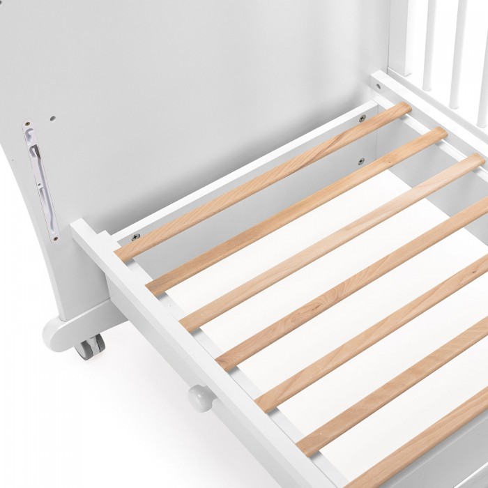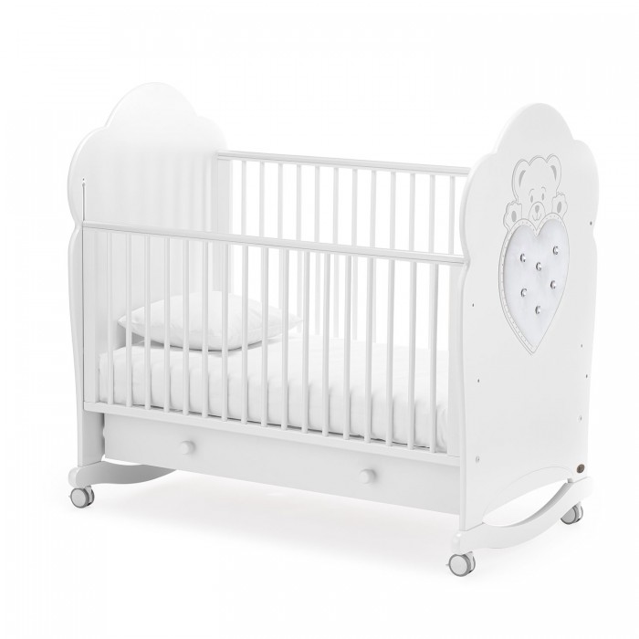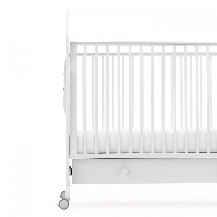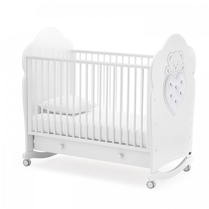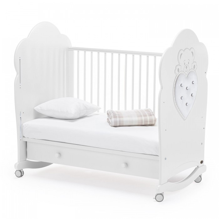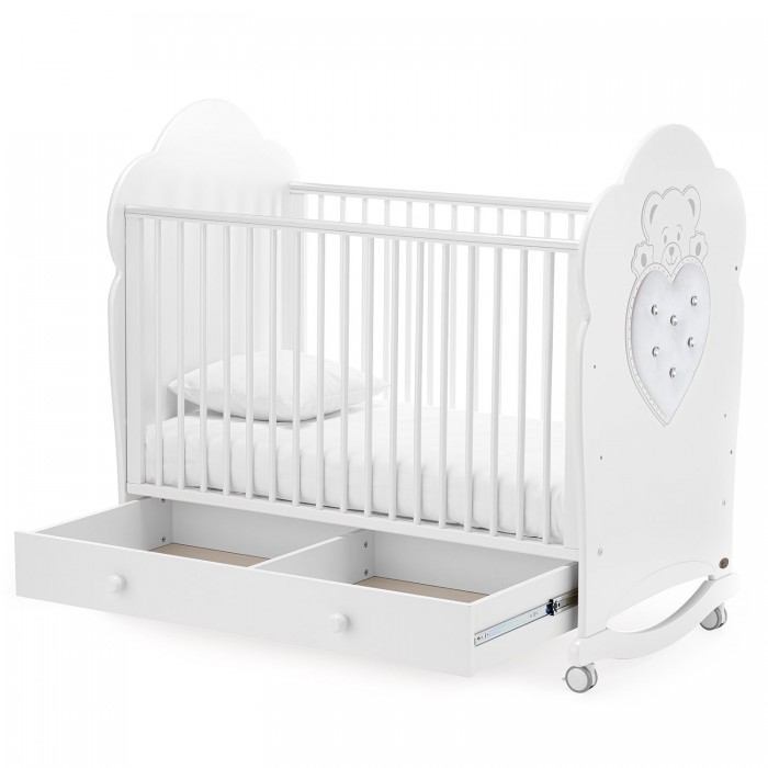 Плавное качание из стороны в сторону прекрасно успокаивает и укачивает новорожденного. Вместительный ящик под кроваткой пригодится для детских вещей и постельного белья.