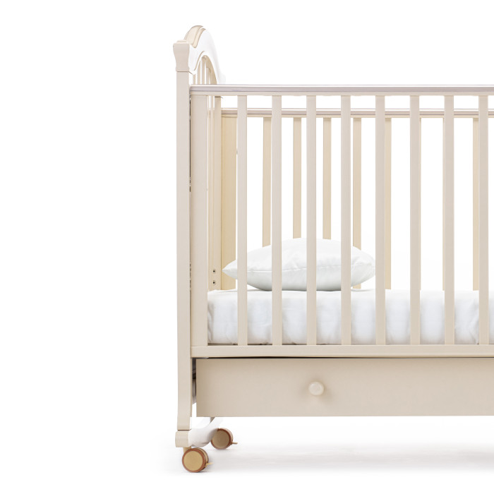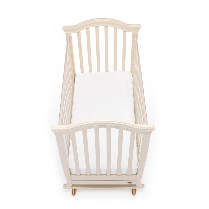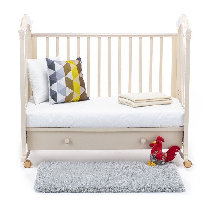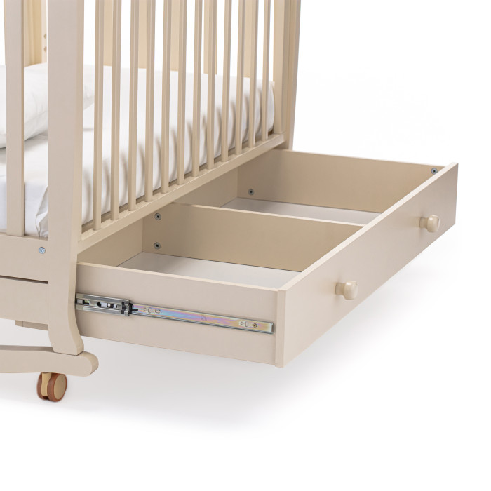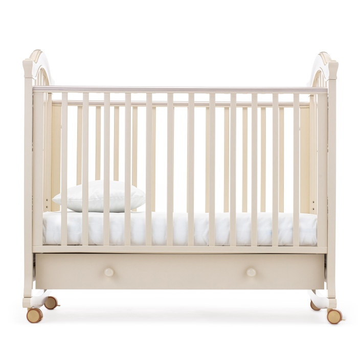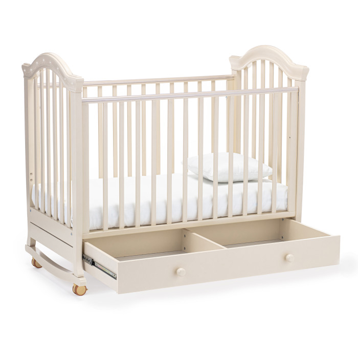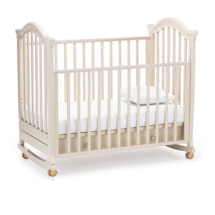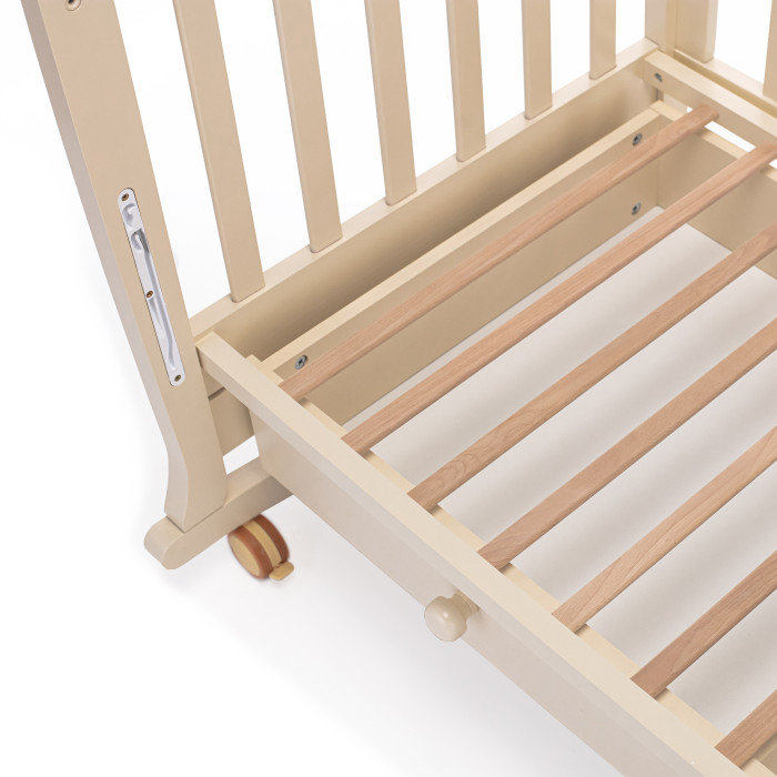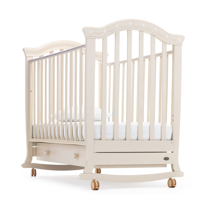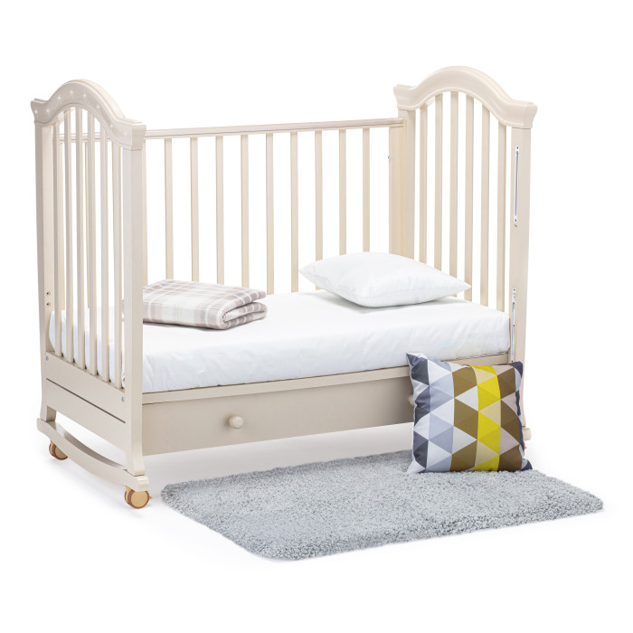 Кровать оснащена полозьями для качания, благодаря чему, кроватка тихо и плавно покачивается из стороны в сторону. Это успокаивает ребенка, настраивает на сон и убаюкивает. Так же модель оснащена удобными колесами со стопорами в цвет кроватки.
