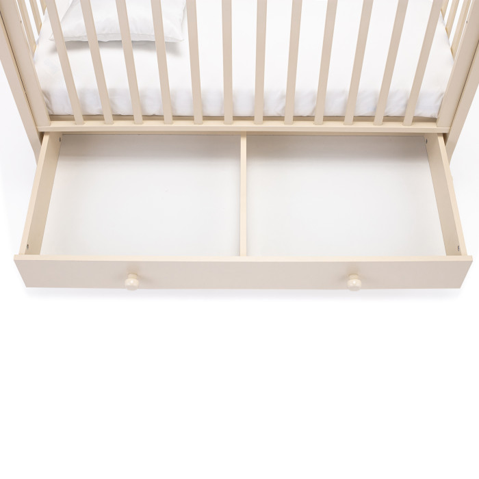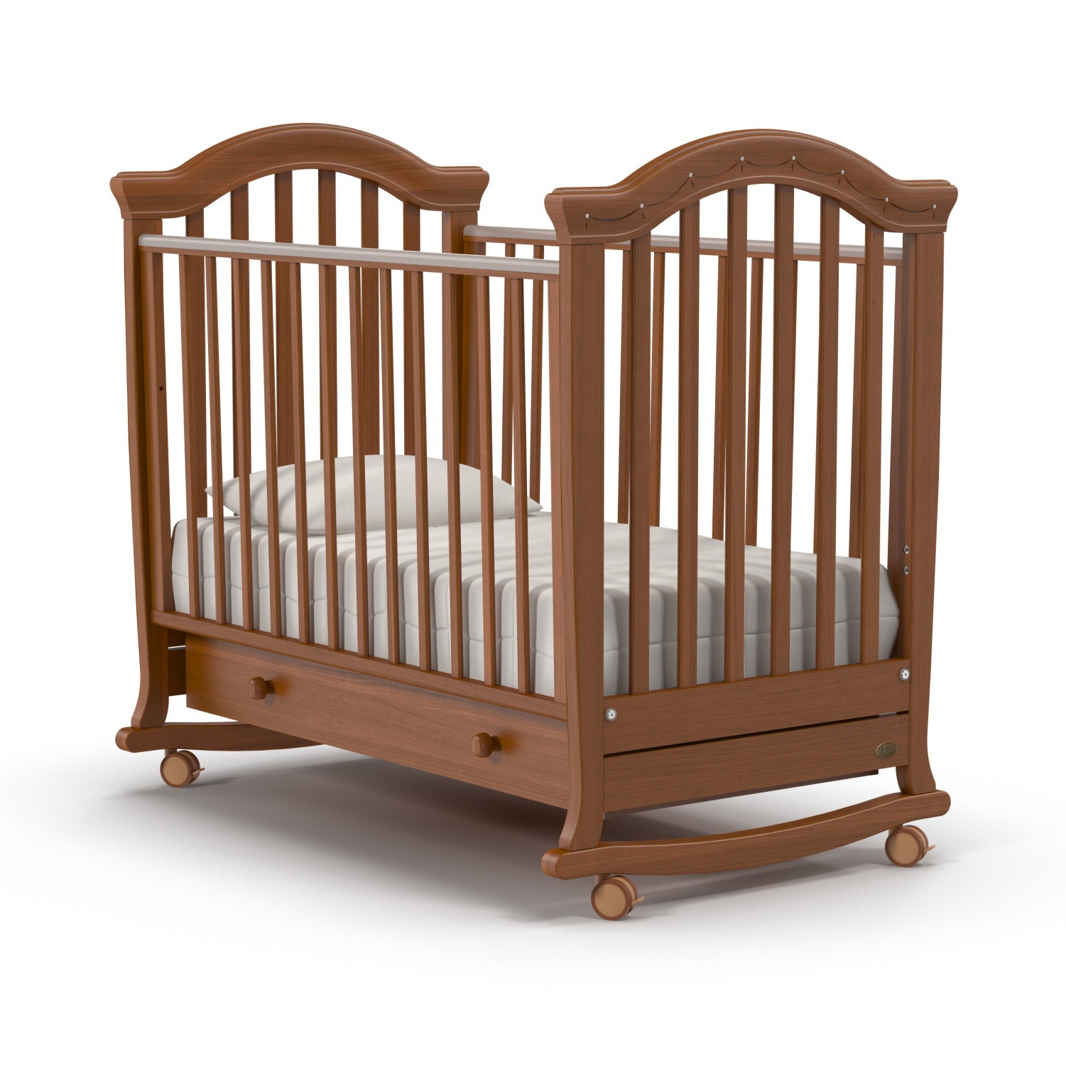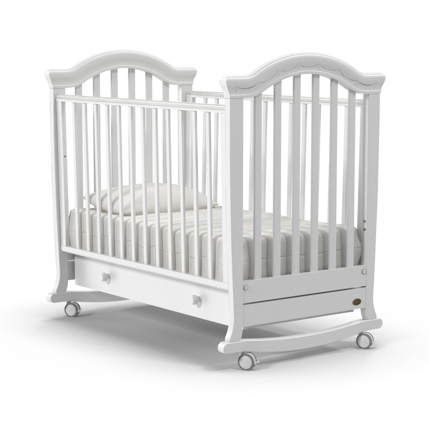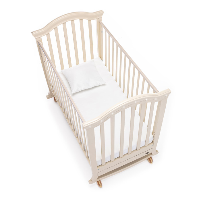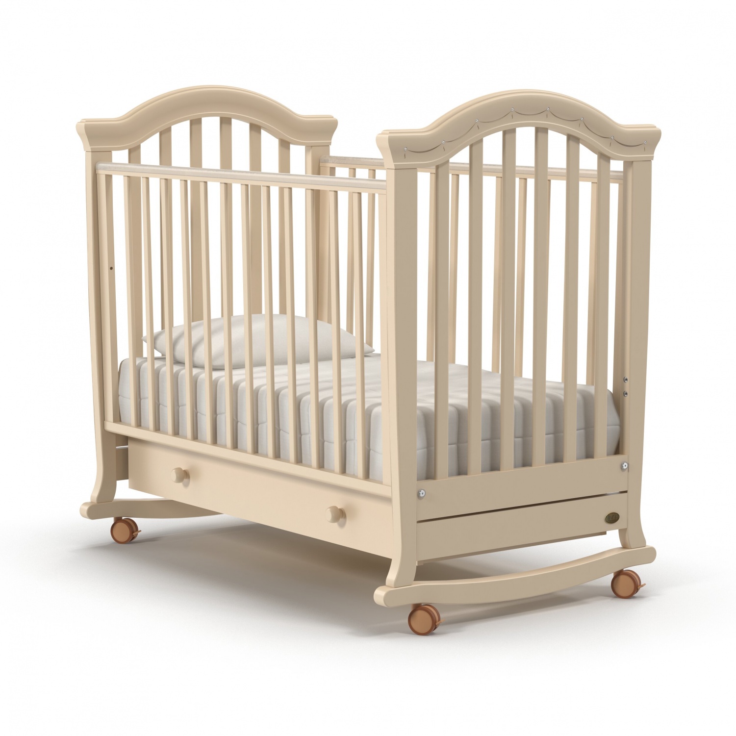 Кровать оснащена полозьями для качания, благодаря чему, кроватка тихо и плавно покачивается из стороны в сторону. Это успокаивает ребенка, настраивает на сон и убаюкивает. Так же модель оснащена удобными колесами со стопорами в цвет кроватки.