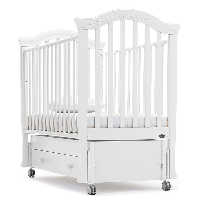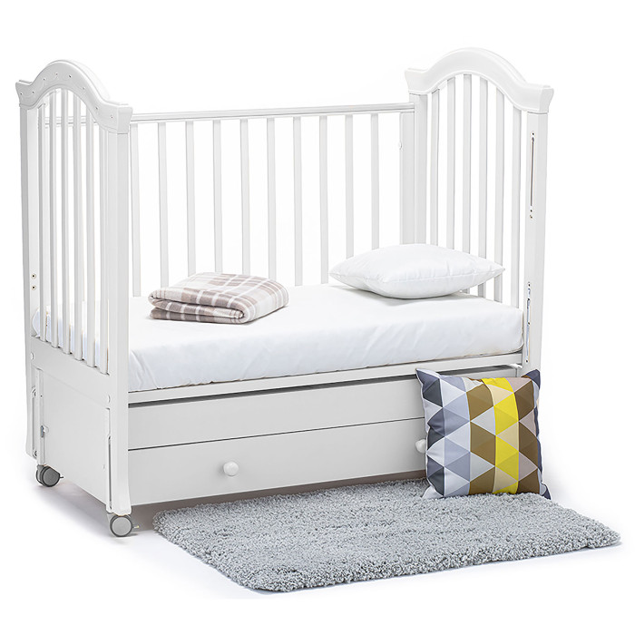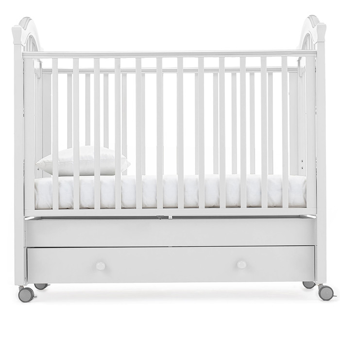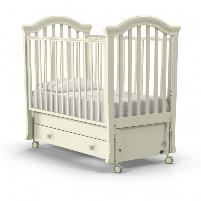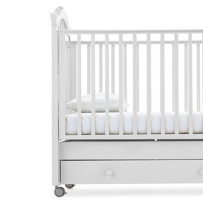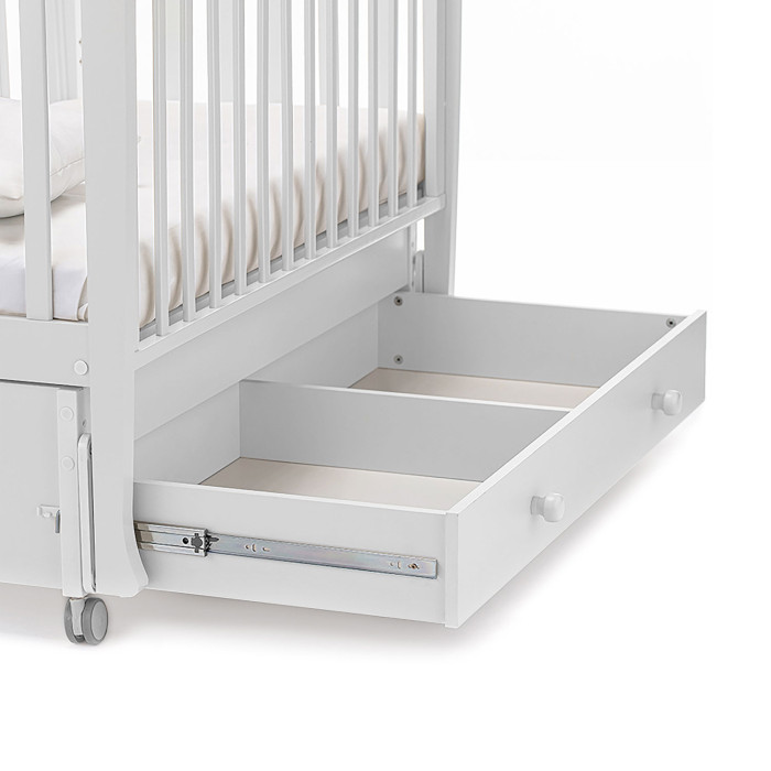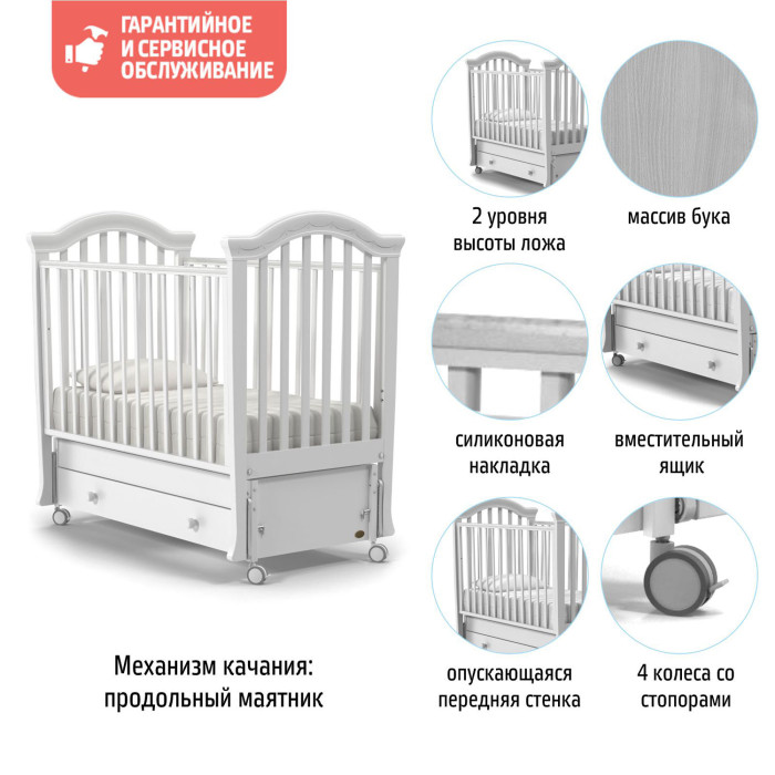 У кровати 2 положения ложа по высоте, регулируемый бортик, 4 колеса со стопорами, маятниковый механизм и вместительный ящик. Это не только красивая, но и безопасная, функциональная и очень удобная кровать для новорожденного.