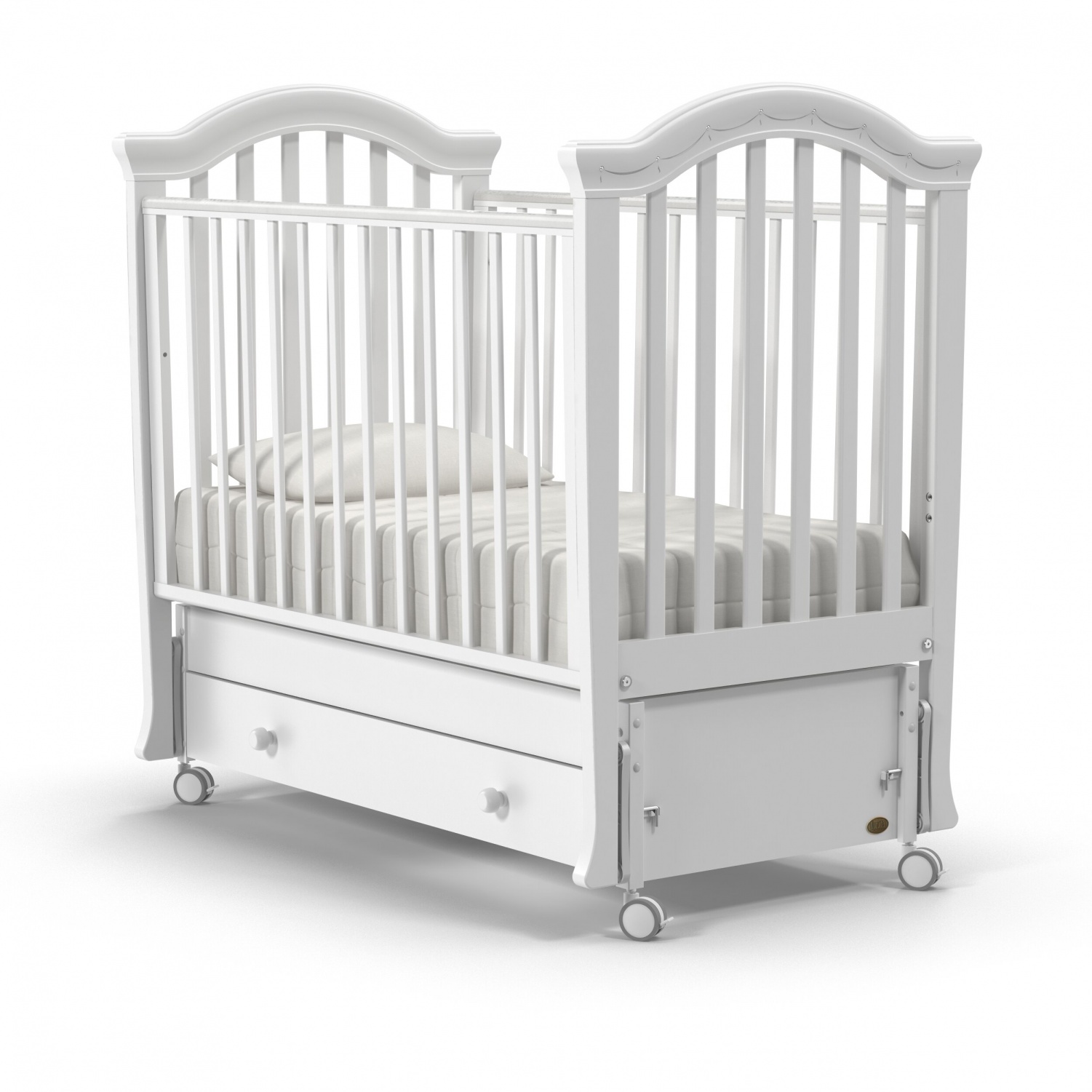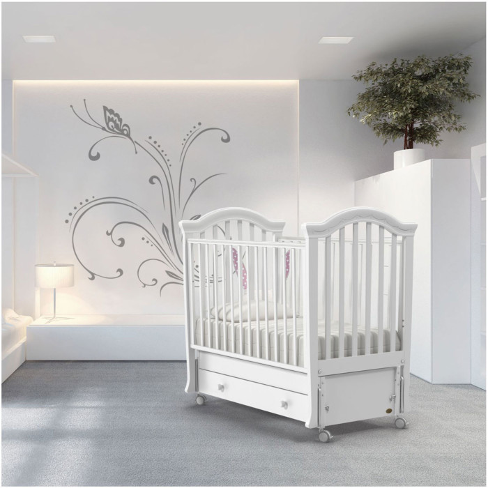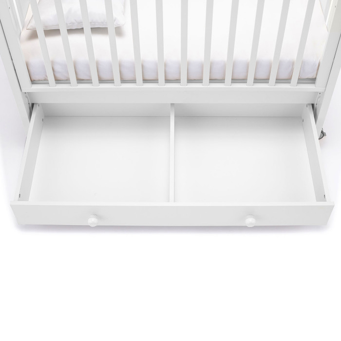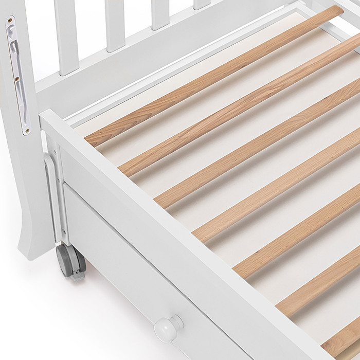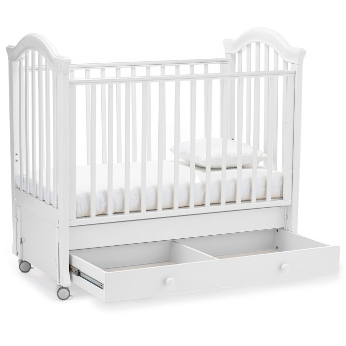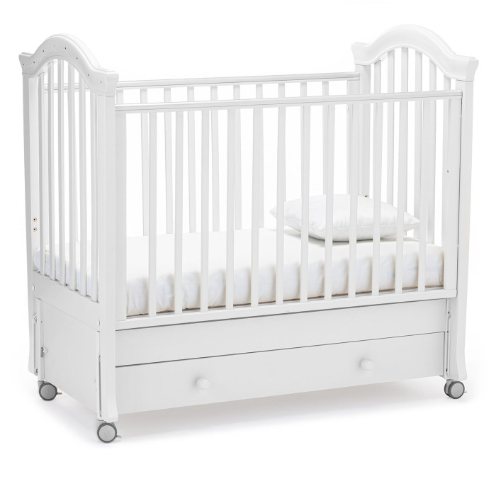 У кровати 2 положения ложа по высоте, регулируемый бортик, 4 колеса со стопорами, маятниковый механизм и вместительный ящик. Это не только красивая, но и безопасная, функциональная и очень удобная кровать для новорожденного.