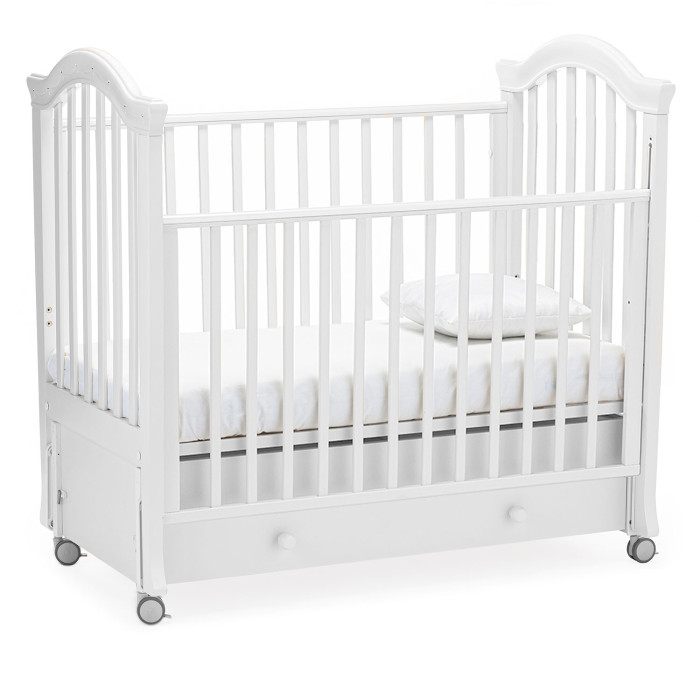 Кровать Nuovita Perla swing (нуовита перла свинг) - красивая кровать с рождения до 4 лет, украшенная нежным узором и стразами. В переводе с испанского "Perla" это жемчуг, поэтому на бортиках кроватки, как красивое ожерелье, раскинулись нити с жемчужинами. Фигурные бортики подчеркивают элегантность модели.