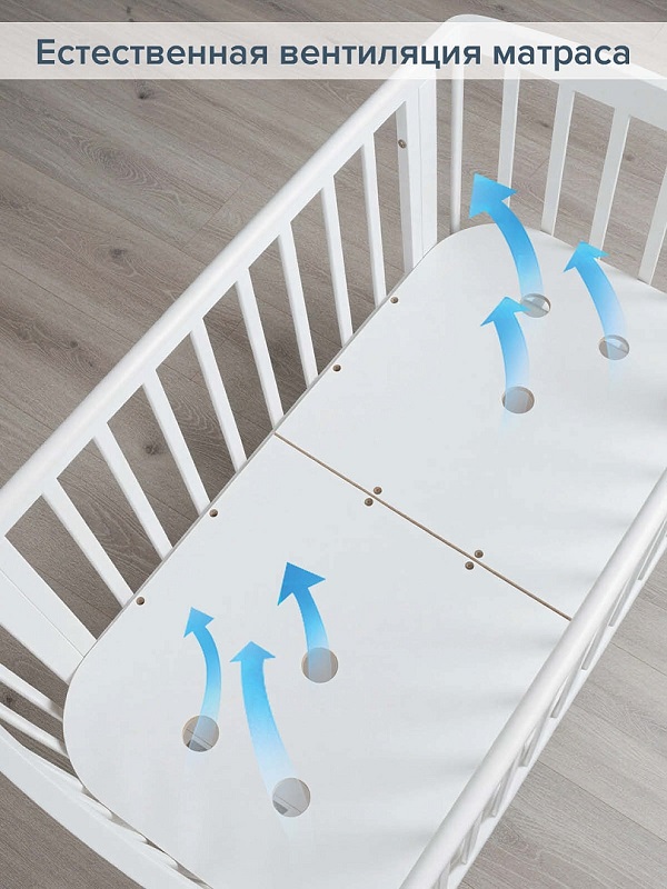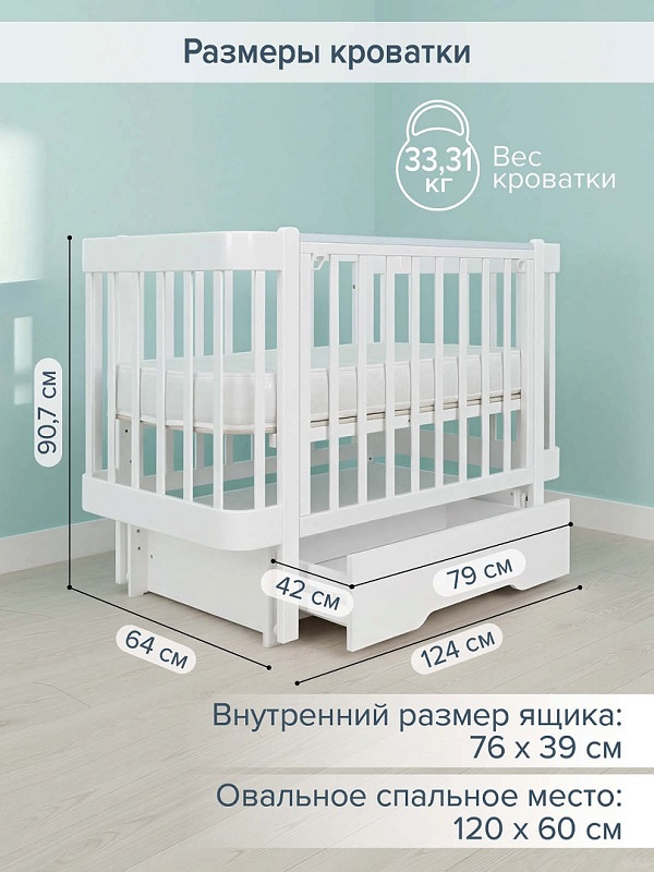 Кроватка имеет один размер спального ложа 120х60 см с регулировкой по высоте в четырех положениях. Для новорожденного ребенка предусмотрен самый верхний уровень, чтобы родителям было максимально удобно доставить и укладывать кроху. По мере роста ребенка спальное ложе опускается все ниже.