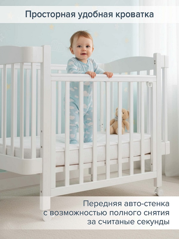 - Передняя авто-стенка с возможностью полного снятия за считанные секунды, для удобного доступа к младенцу.