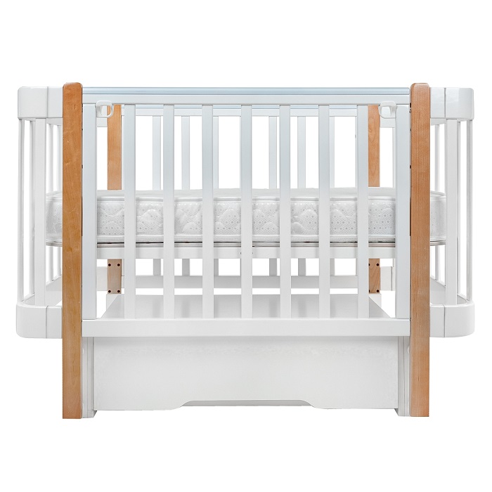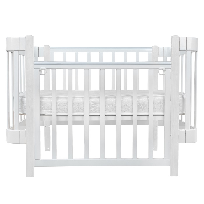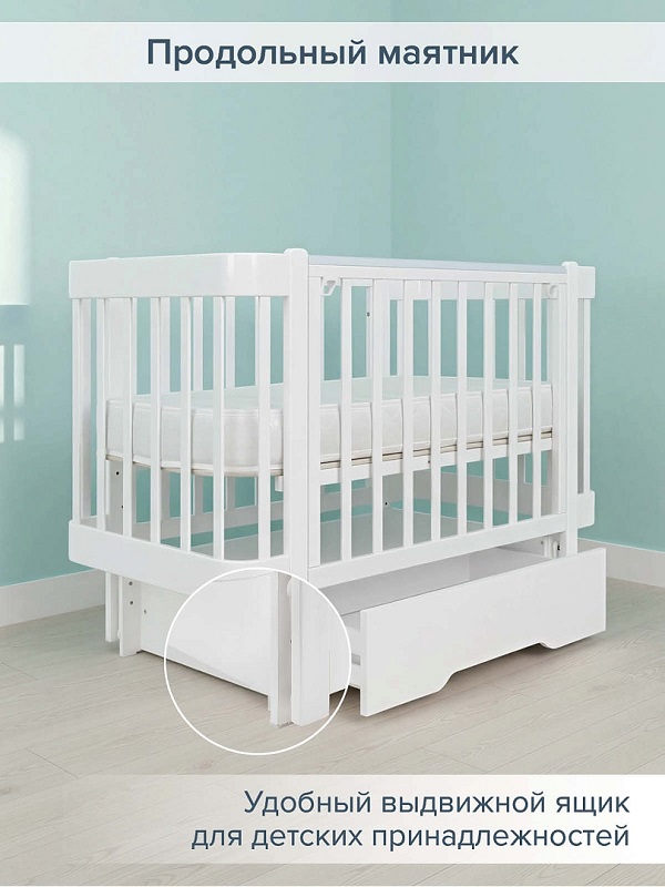 Кровать оснащена ножками (колеса можно установить отдельно, в комплекте не идут), а так же маятником продольного качания. Маятник позволит плавно покачивать кроватку, помогая ребенку быстрее успокоиться и настроиться на сон.