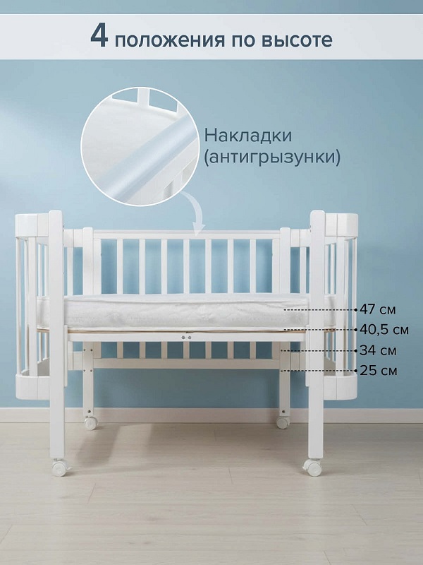- Ложе кроватки имеет 4 положения по высоте: от пола (25 см±1 см; 34 см±1-2 см; 40,5 см±1-2 см; 47 см±1-2 см).