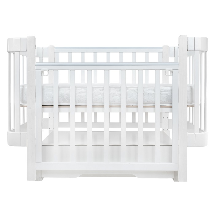 Благодаря передней, легкосъемной стенки, кроватка буквально за считанные секунды может превратиться в диванчик или приставную модель, для сна рядом с родителями. Под кроваткой размещен вместительный ящик, который позволит удобно хранить все спальные принадлежности для малыша, в том числе конверт, бортики, одеялки.